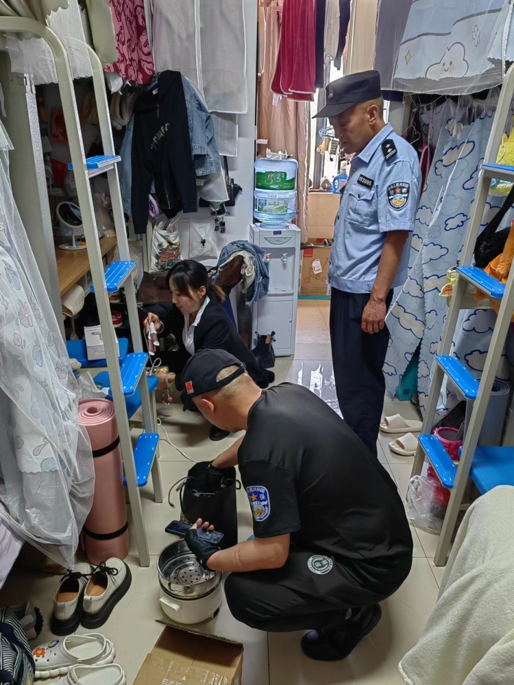 为进一步强化公寓管理,保障学生住宿安全,4月19日,邀请学校驻地罗白派出所社区民警金警官一行,兵分八组,每组由社区民警、宿舍管理员、保安员组成的安全检查小组,对学校8栋公寓楼的2000余间宿舍进行突击检查,对检查发现的大功率电器等公寓违禁用品进行临时管理,并向同学们宣传消防安全等注意事项。