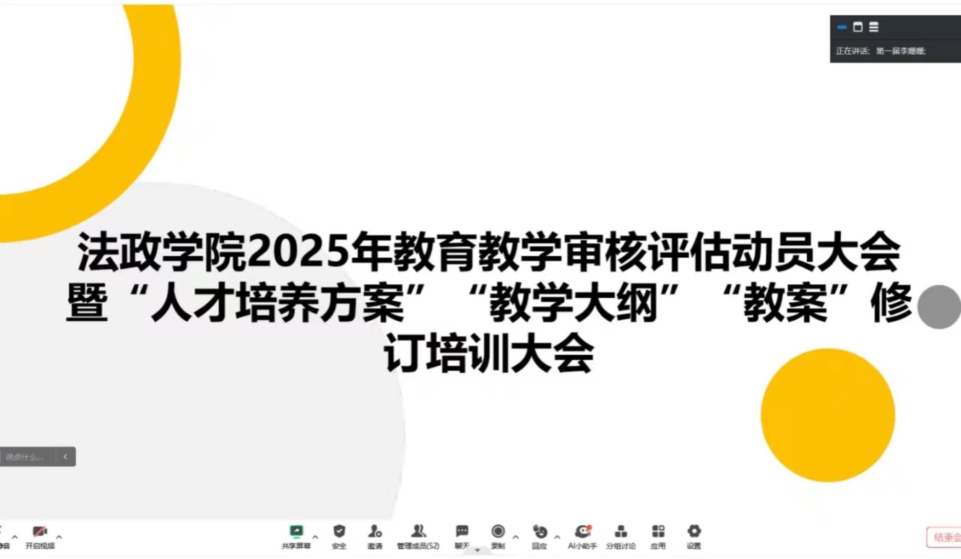 为切实落实立德树人根本任务,牢固树立人才培养中心地位和本科教育教学核心地位,做好2025年本科教育教学审核评估工作,法政学院于1月29日通过腾讯会议组织召开2025年本科教育教学审核评估动员会暨“人才培养方案”、“教学大纲”和“教案”修订培训大会,学院全体教职工参会。