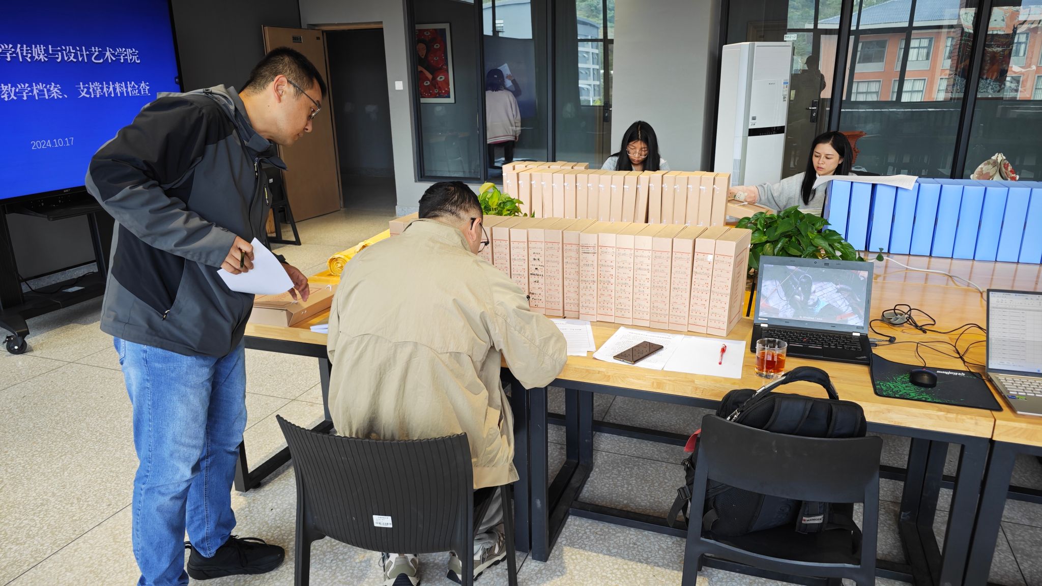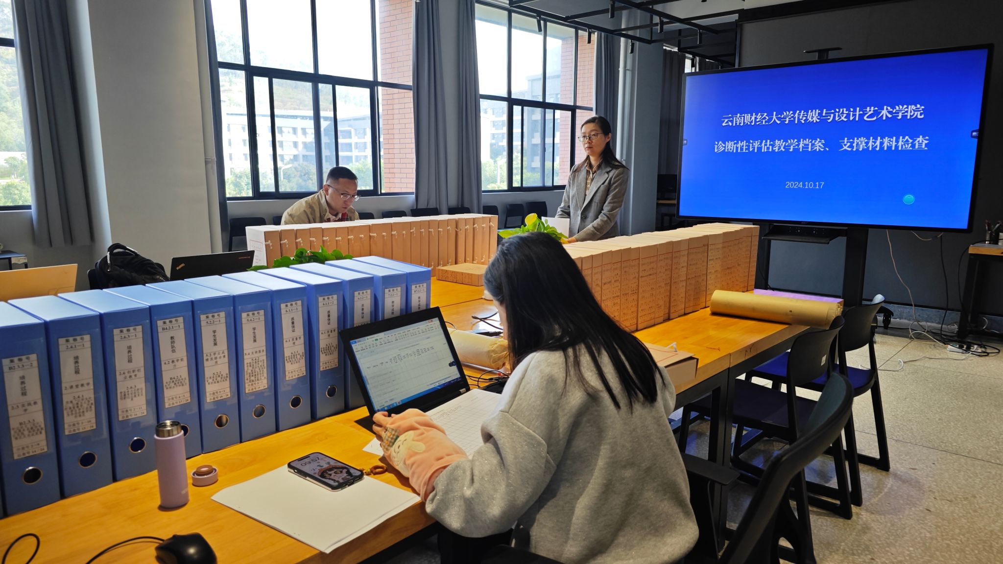 为进一步规范各类教学档案管理,扎实有序推进学院教育教学诊断性评估前期准备工作,2024年10月17日,传媒与设计艺术学院诊断性评估教学档案、支撑材料检查工作在齐远楼303开展。