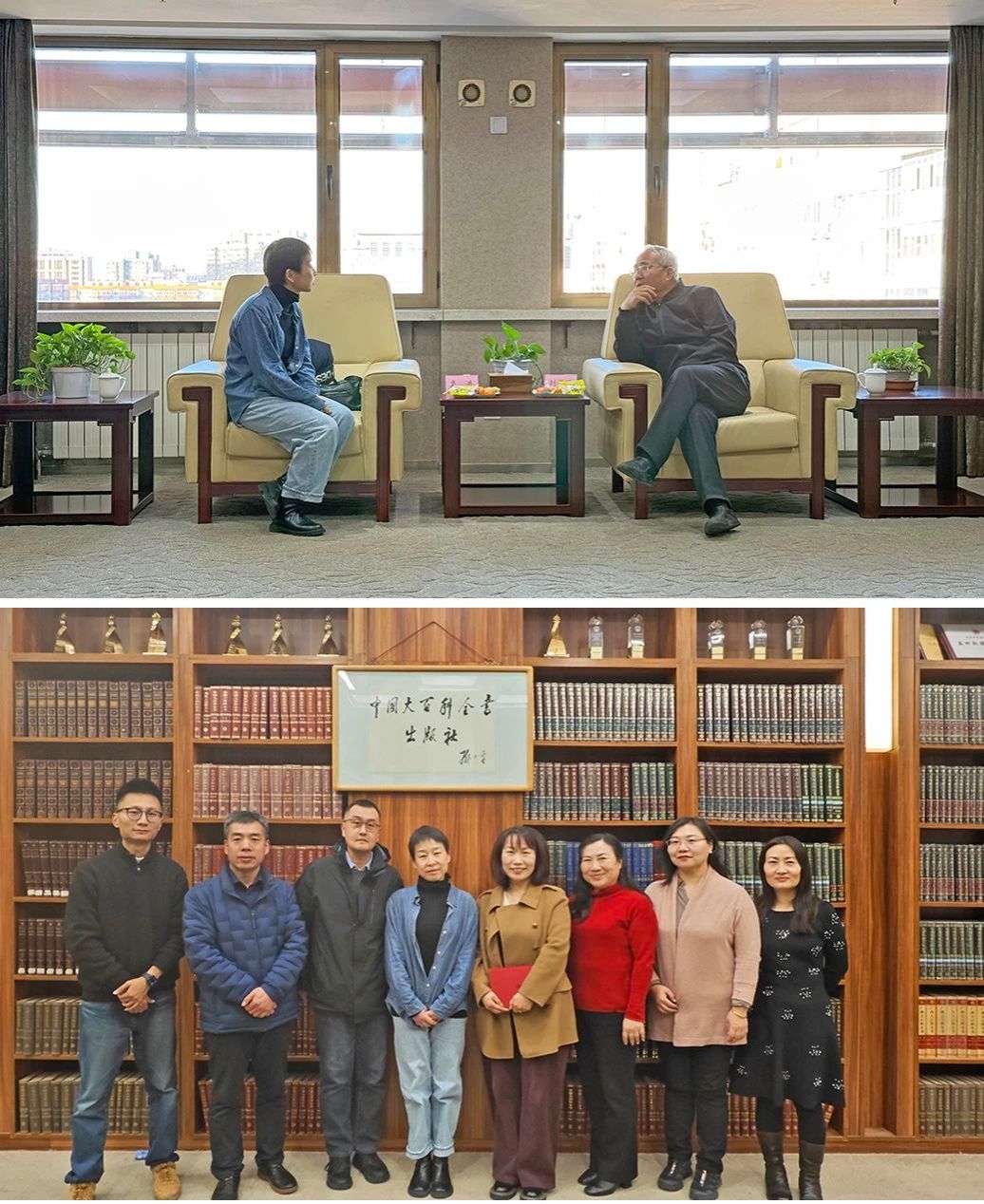 在中国大百科全书出版社,学院一行同社长刘祚臣,副总编刘金双,教育分社社长孙静,期刊中心主任,《百科知识》杂志主编赵新宇,及副编审刘浪老师进行深入交流。刘祚臣对学院教师的到来表示热烈欢迎,并介绍了出版社的发展情况。他指出,习近平总书记将中国大百科全书出版社定位为“权威知识宝库”,出版社不仅拥有深厚的学术沉淀,更紧跟时代步伐,在数字化、多元化出版领域取得了丰硕成果。出版社将发挥自身优势,结合传艺学院地域特色,为学院教师提供多样的选题切入,从专业学科视角、出版市场维度,进行全方位共建。袁洪表示,学院希望未来和出版社进一步加深合作,对系列成果进行出版转化。双方还就学生实习实践、行业导师聘用、杂志专栏投稿等方面进行了深入探讨,并诚挚邀请出版社团队赴学院实地考察,为进一步合作筑牢根基。