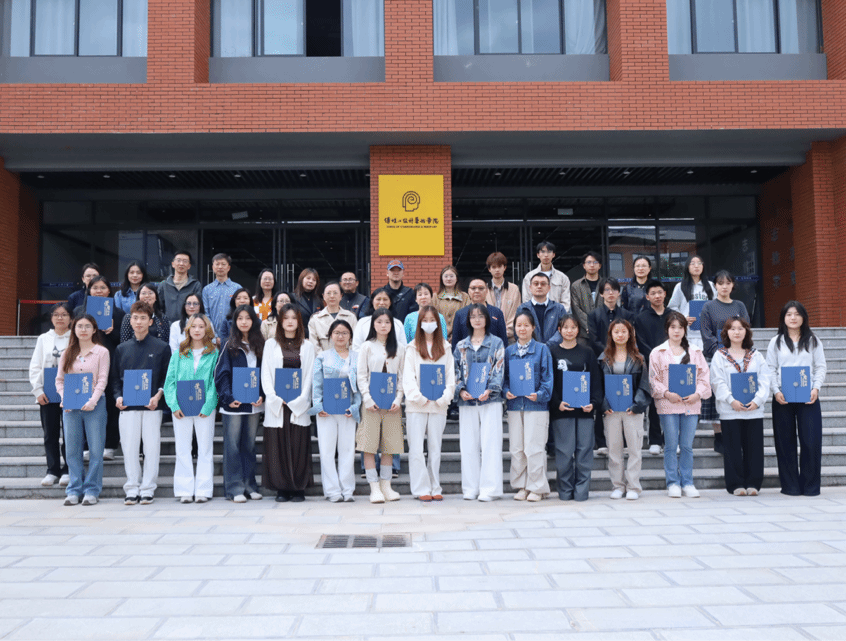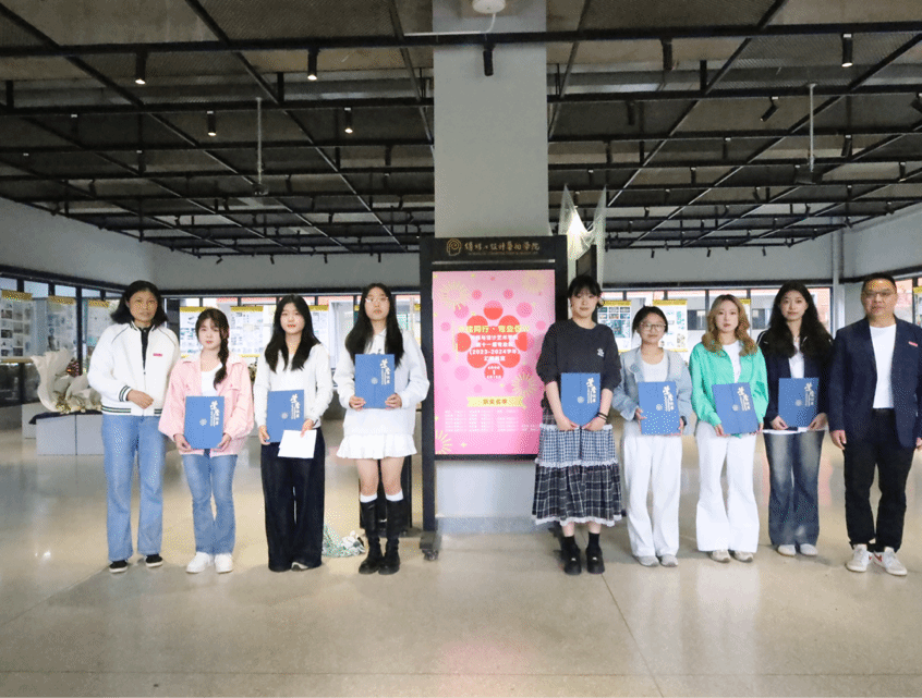典礼结束后,全体参会人员合影留念。学院党委书记张波宣布“专业奖”汇报展正式开展,与会师生共同参观获奖作品展览。他在总结中强调,此次展览集中展示了学院各专业教育的成果,为师生提供了宝贵的交流学习机会,学院将以审核评估为契机,持续完善“艺术+财经”复合型人才培养模式。