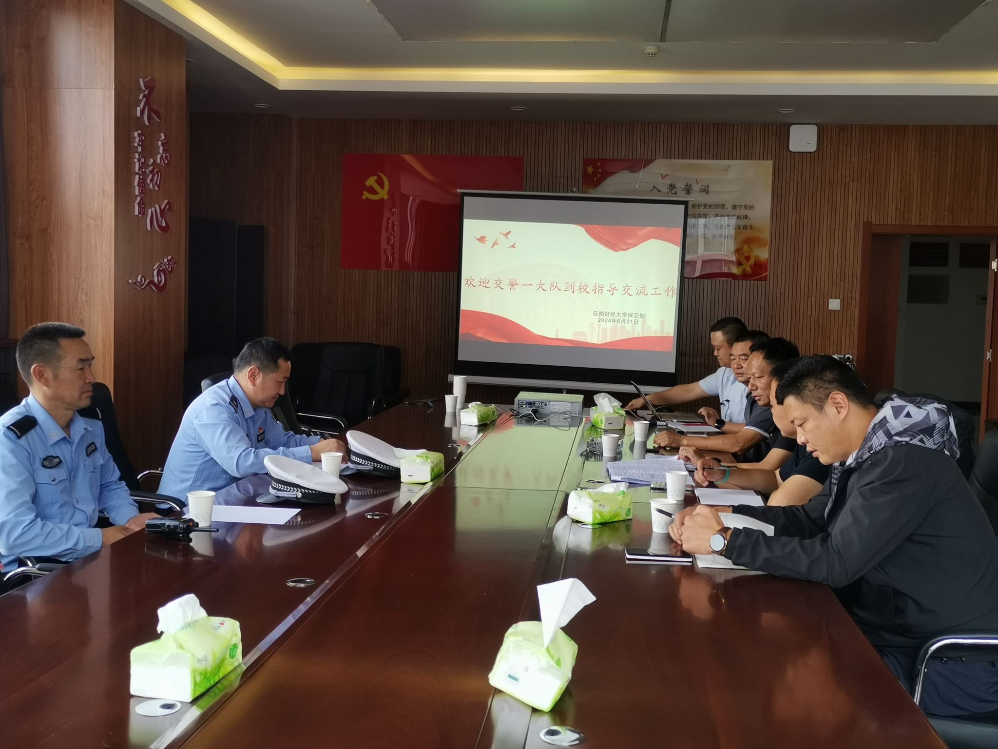 2024年6月21日,为了进一步提升校园交通安全管理水平,确保师生的出行安全,保卫处积极行动,特别邀请了昆明市交警一大队六中队中队长贺伟等一行人来学校进行交流指导。在深入的探讨与交流中,我们共同审视了学校及其周边区域存在的交通安全问题,如共享助力车的规范管理、机动车的随意停放、校内交通标识设置不足、校园内不文明骑行现象,以及校门口占道经营等一系列问题,并针对这些问题探讨了切实有效的解决措施。这次交流的核心目的在于加强bat365官网师生的交通安全意识,预防潜在的交通安全隐患,并提升大家的自我保护能力。
