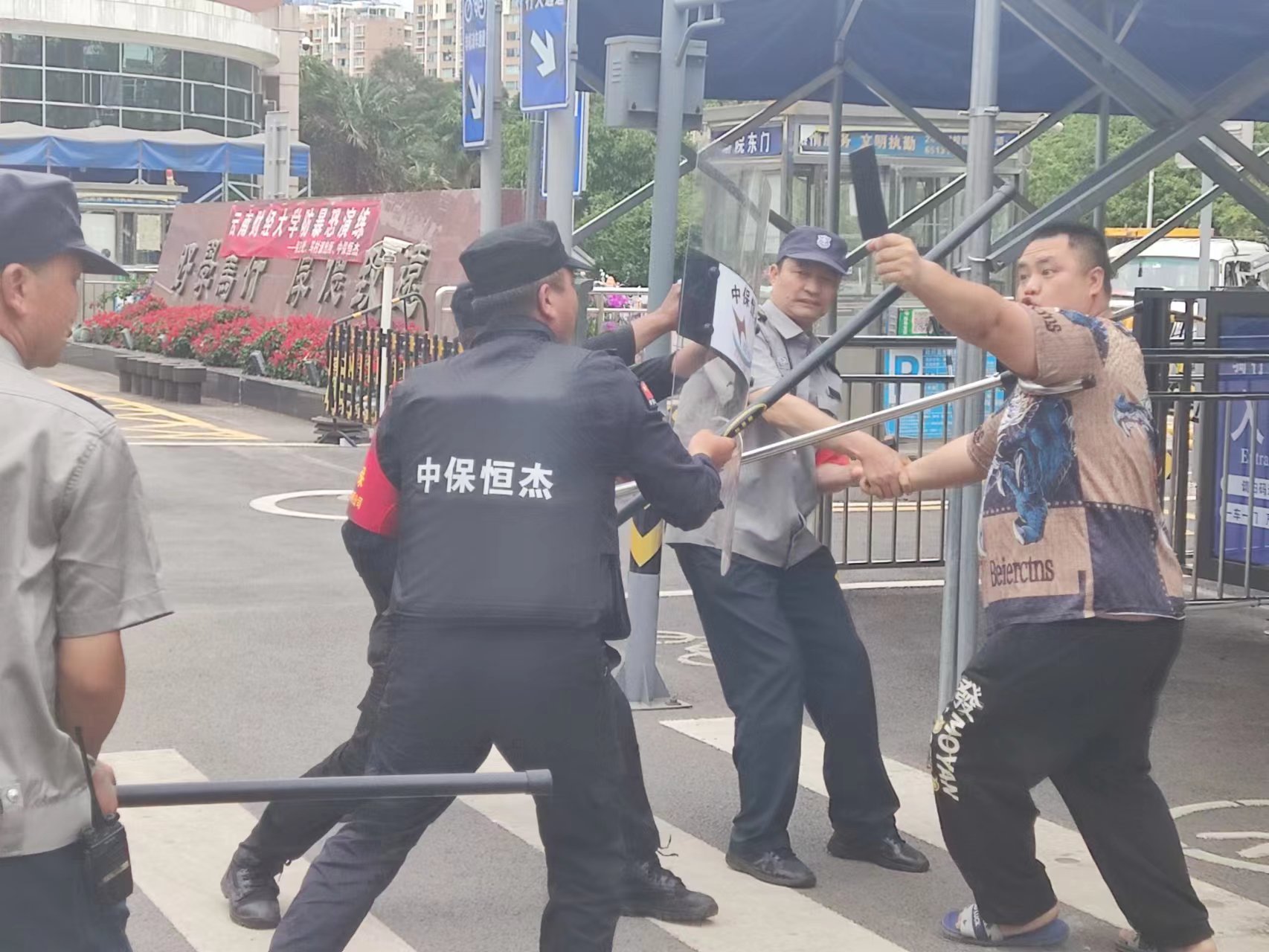 下午3时,演练开始。在龙泉路校区南院东门(南),门外一名“醉酒人员”欲强行闯入校园,门卫执勤人员立即上前询问、盘查,该“歹徒”随即拿出砍刀对执勤人员进行砍杀,其他执勤人员立即手持防暴器械对该“歹徒”进行控制,紧急疏散周边人员,同时呼叫应急分队支援并及时报警。几分钟后,在派出所警员的增援下共同将“歹徒”制服。