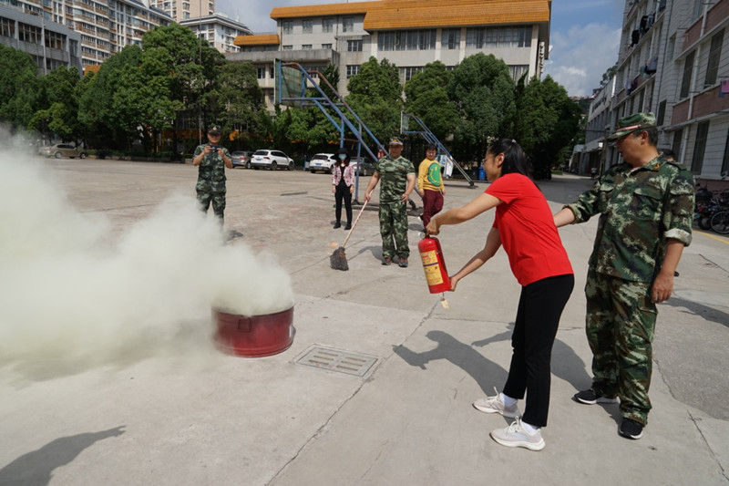 讲座结束后,教职工来到汇新篮球场,在消防科张建荣科长的现场指导下开展消防灭火演练。大家依次学习使用干粉灭火器进行灭火演练,接受了生动实用的消防技能培训。