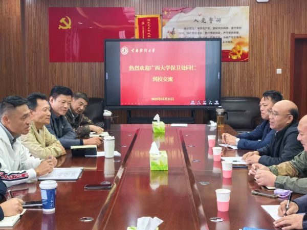 保卫处处长毛瑞红对广西大学保卫处一行表示热烈的欢迎,并介绍了学校在安全保卫方面的总体情况。他表示,借此次交流的契机,进一步推动两校保卫部门在管理机制优化、服务能力提升和管理经验共享等方面相互借鉴学习、共同提升,同时希望两校加强日常沟通,共促业务水平和管理效能双丰收。