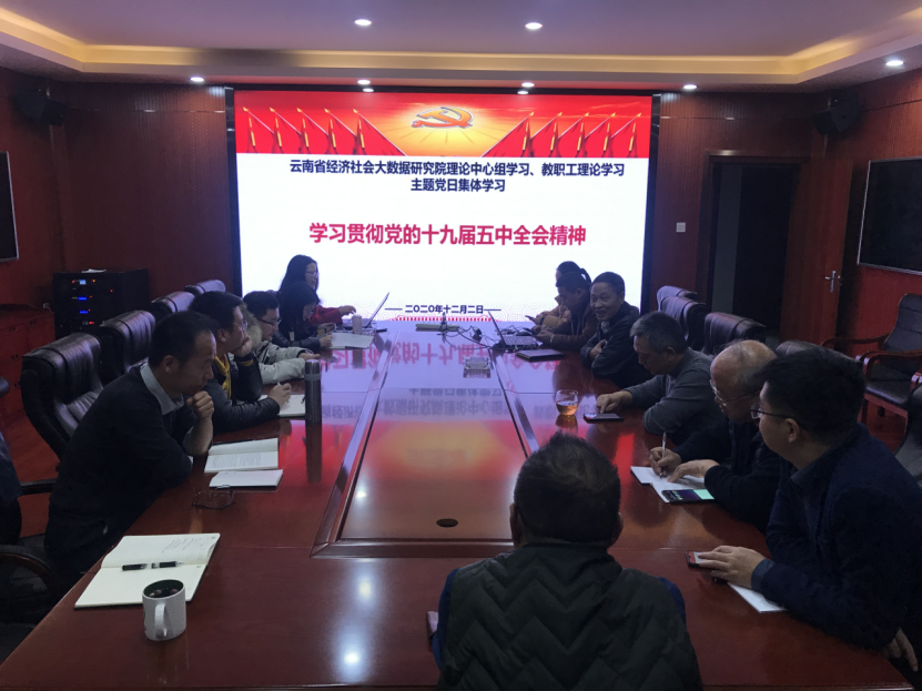 2020年12月2日晚,云南省经济社会大数据研究院直属党支部组织开展理论学习中心组第七次集体学习暨教职工理论学习活动,学习贯彻党的十九届五中全会精神。直属党支部书记余建坤主持本次学习,中心组成员、支部宣传委员白涛珍领学,直属党支部全体党员同步参加本次学习活动。