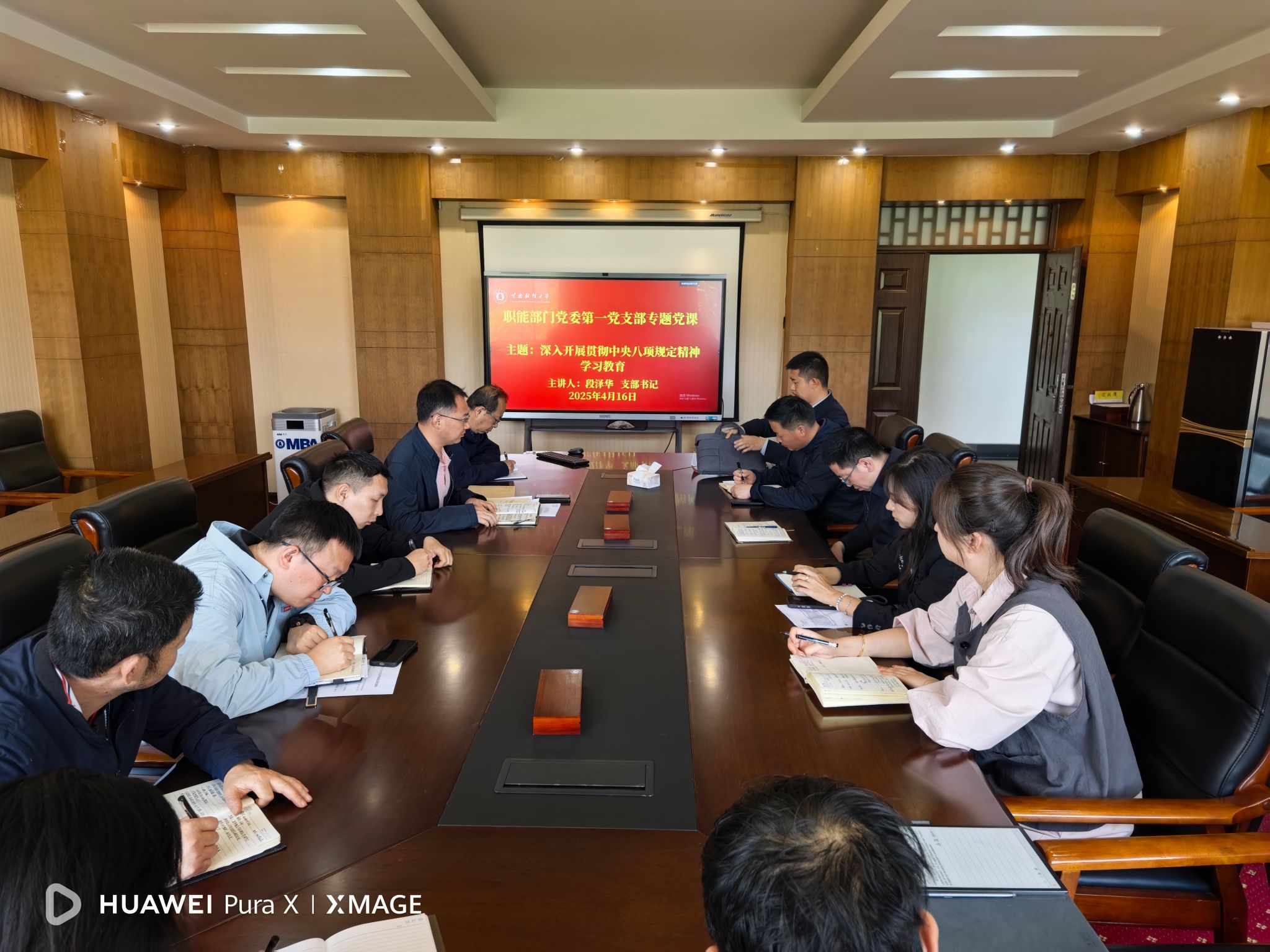 2025年4月16日,职能部门党委第一党支部开展深入贯彻中央八项规定精神学习教育专题党课活动。支部书记段泽华同志围绕“为什么学、学什么、怎么学(做)”三个维度,系统阐释了深入贯彻中央八项规定精神的核心要义和实践要求,要求全体党员以学促行、以行践学,深学细悟习近平总书记关于加强党的作风建设的重要论述,准确领会中央八项规定及其实施细则精神的重要内涵,进一步增强纪律意识和责任担当。