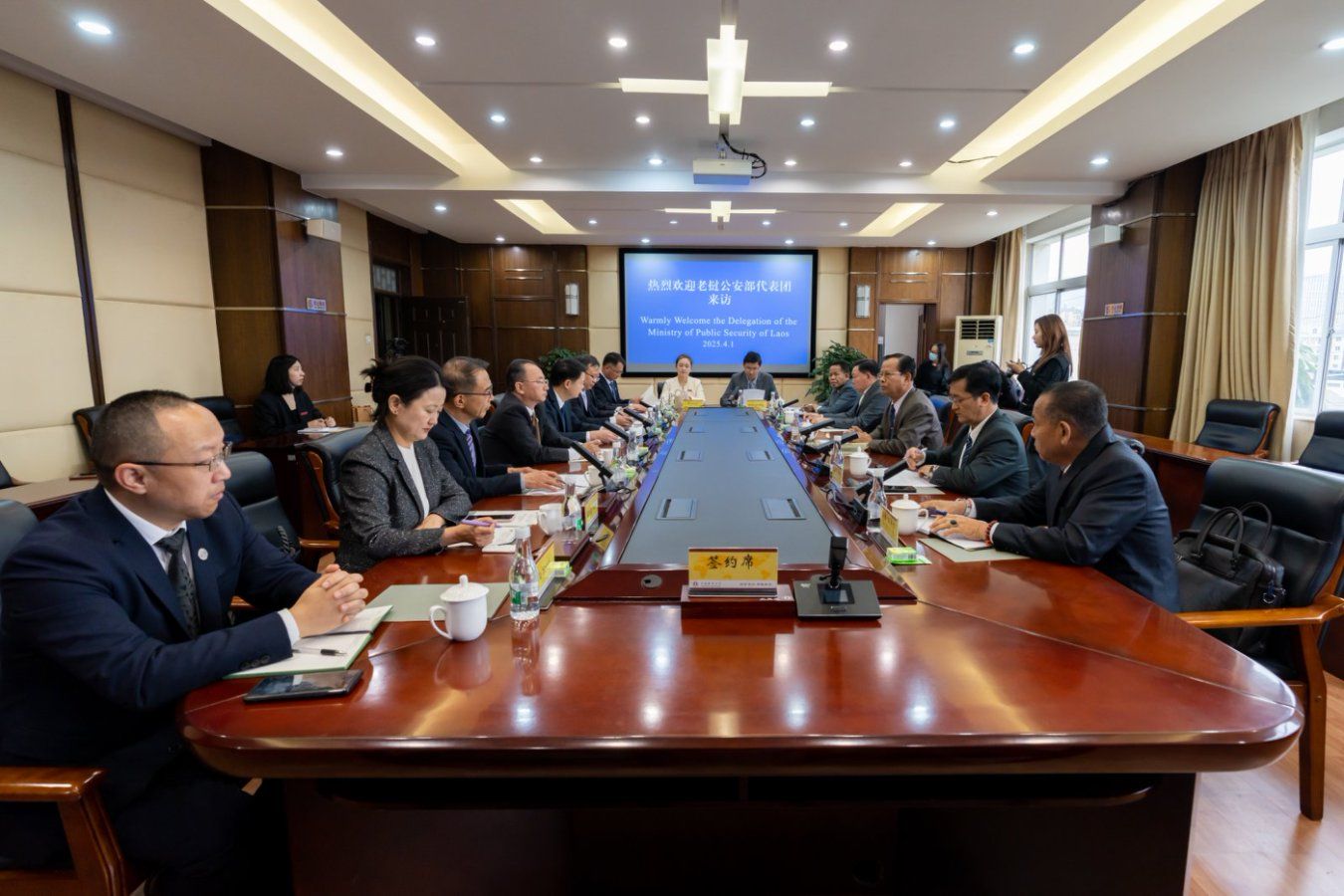 陈红代表学校对老挝公安部代表团的到来表示热烈欢迎,回顾总结了近年来学校与老挝合作取得的主要成果。他强调,老挝和中国是山水相连的友好邻邦,学校与老挝公安部的教育合作,是积极响应共建“一带一路”和构建“中老命运共同体”的生动写照。他表示,学校将充分发挥区位优势和学科优势,与老挝公安部共同探索打造基于政府高校合作框架下,实现“境内境外相结合”“长期短期相结合”“线上线下相结合”“在职脱产相结合”四个结合的创新性人力资源业务能力提升平台,培养更多高素质的专业人才,并继续深化与老挝相关部门在教育、文化、数字经济、跨境贸易等领域的合作。