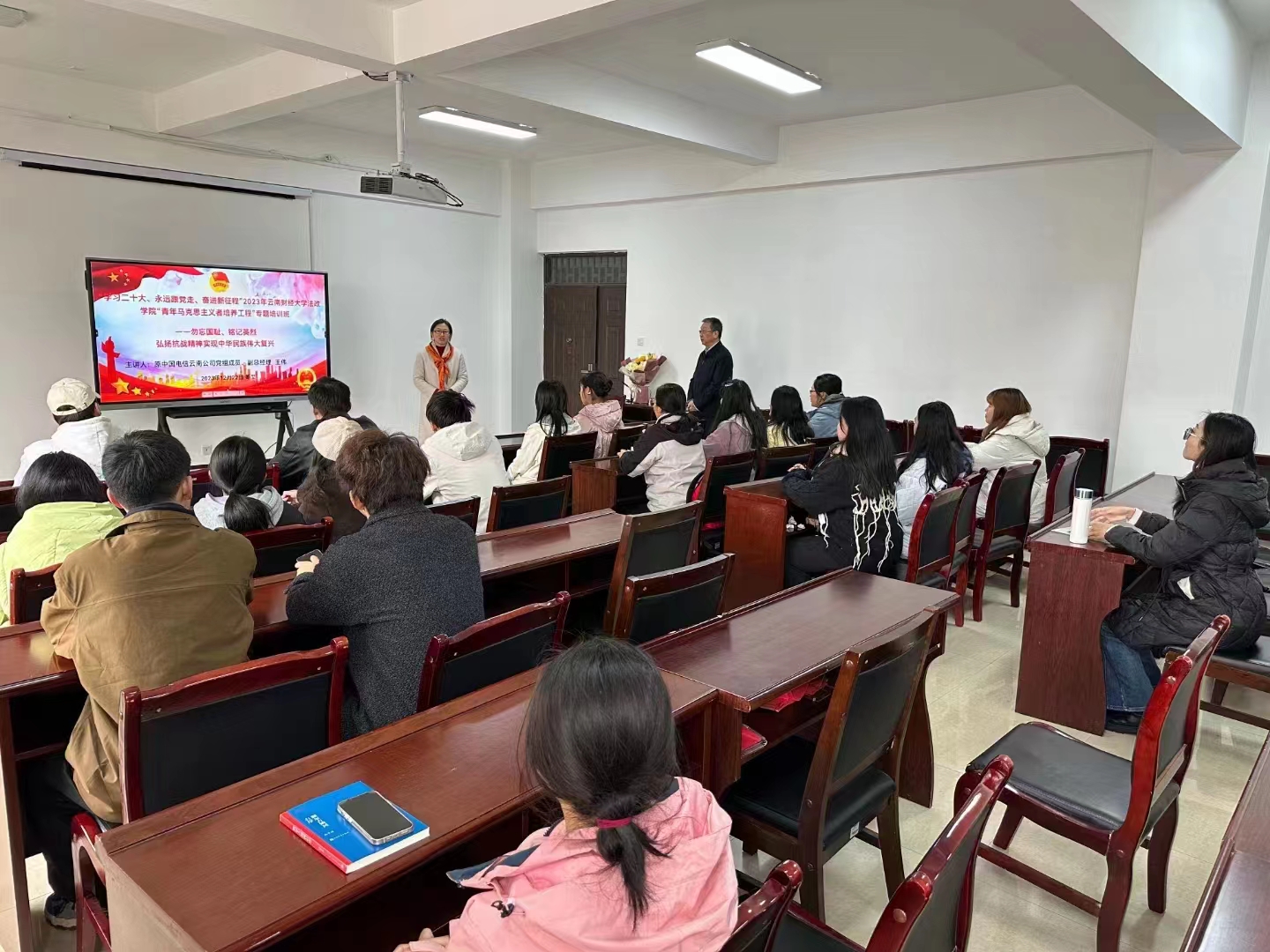 为了铭记抗日战争历史、传承伟大的爱国主义精神,2023年12月22日,bat365在线中国官网登录入口法政学院团委举办了题为《勿忘国耻 铭记英烈 弘扬抗战精神 实现中华民族伟大复兴》的爱国主义讲座。讲座邀请了欧阳杉副教授作为主持人,烈士后裔王伟老师作为主讲人,法政学院100余名团学骨干参加本次讲座。