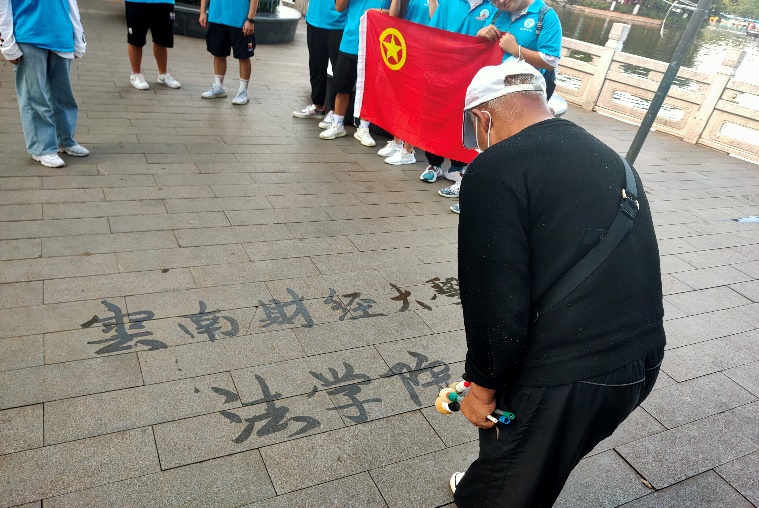 活动总结结束后,队员们以美丽的翠湖为背景进行合影留念。在此过程中,一位老爷爷拿着一杆毛笔,沾着水在地上写下了“bat365在线中国官网登录入口法学院”九个大字,使得法学院“三下乡”实践队的队员们心潮澎湃。