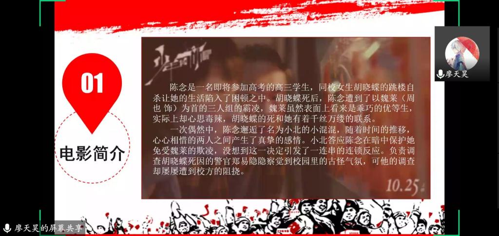 活动开始,主持人简单地介绍了影片,本次观影选取的影片是《少年的你》,作为揽获了金像奖8座大奖的电影,《少年的你》讲述了在高考前夕,被一场校园意外改变命运的两个少年,如何守护彼此成为想成为的成年人的故事。影片中的魏莱名字叫未来,可却没有了未来,究其原因,也是因为自己的言行。在影片播放过程中,同学纷纷在弹幕中表达了自己的感想,作为一个青年要时刻拥有法治观念,知法懂法。有人生活在阴沟里,但依然有人在仰望星空,我们无论什么时候都要心存希望,心怀正义,不要轻易放弃。活动结束之后,同学们提交了影片观后感。