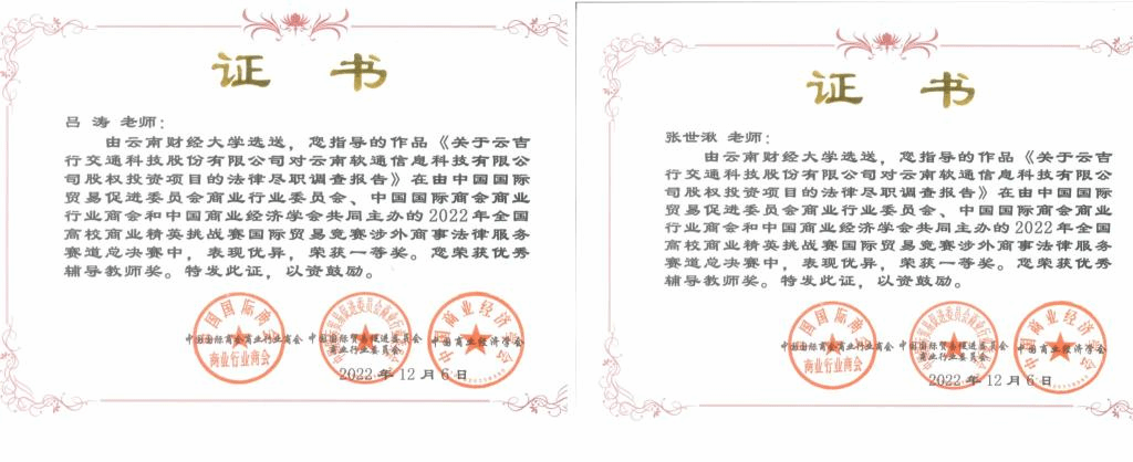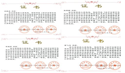 在吕涛、张世湫两位老师的指导下,法政学院吴毅成(研究生)、张若楠、李婉茹、雷飞龙(本科生)四位同学分别在2022年全国高校商业精英挑战赛国际贸易竞赛(涉外商事法律服务赛道)总决赛中荣获一等奖。