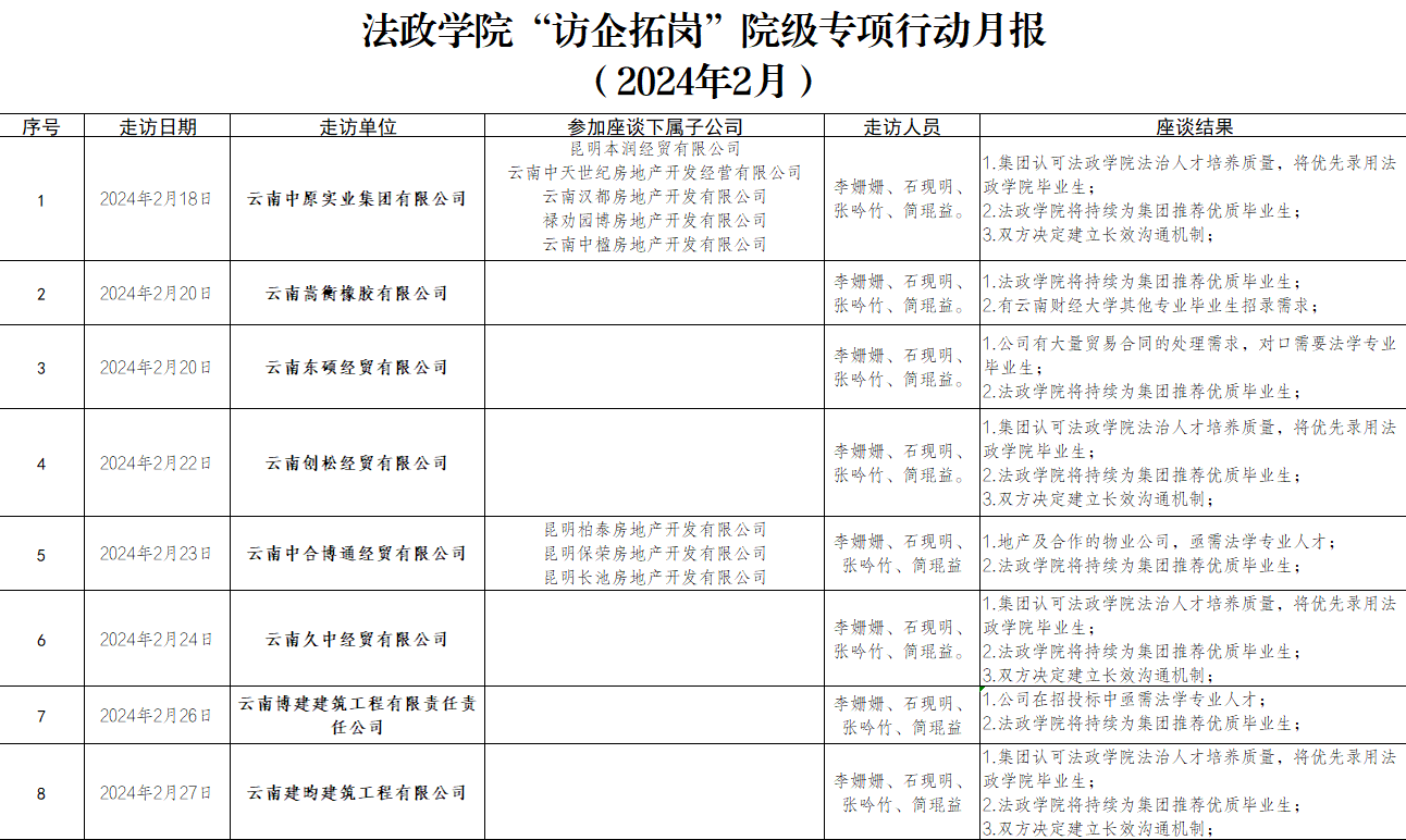 院级访企拓岗专项行动小组走访了云南中原实业集团有限公司、云南嵩衡橡胶有限公司、云南东硕经贸有限公司、云南创松经贸有限公司、云南中合博通经贸有限公司、云南久中经贸有限公司、云南博建建筑工程有限责任责任公司、云南建昀建筑工程有限公司及相关集团公司下属分子公司,结合学院专业人才培养特点和走访单位业务方向,围绕促进2024届毕业生就业为核心目标,积极开展岗位拓展和人才推荐对接,借助法政学院科研力量、师资储备等专业资源,积极与用人单位开展实习实践基地、横向科研项目合作对接,访企拓岗成效明显。