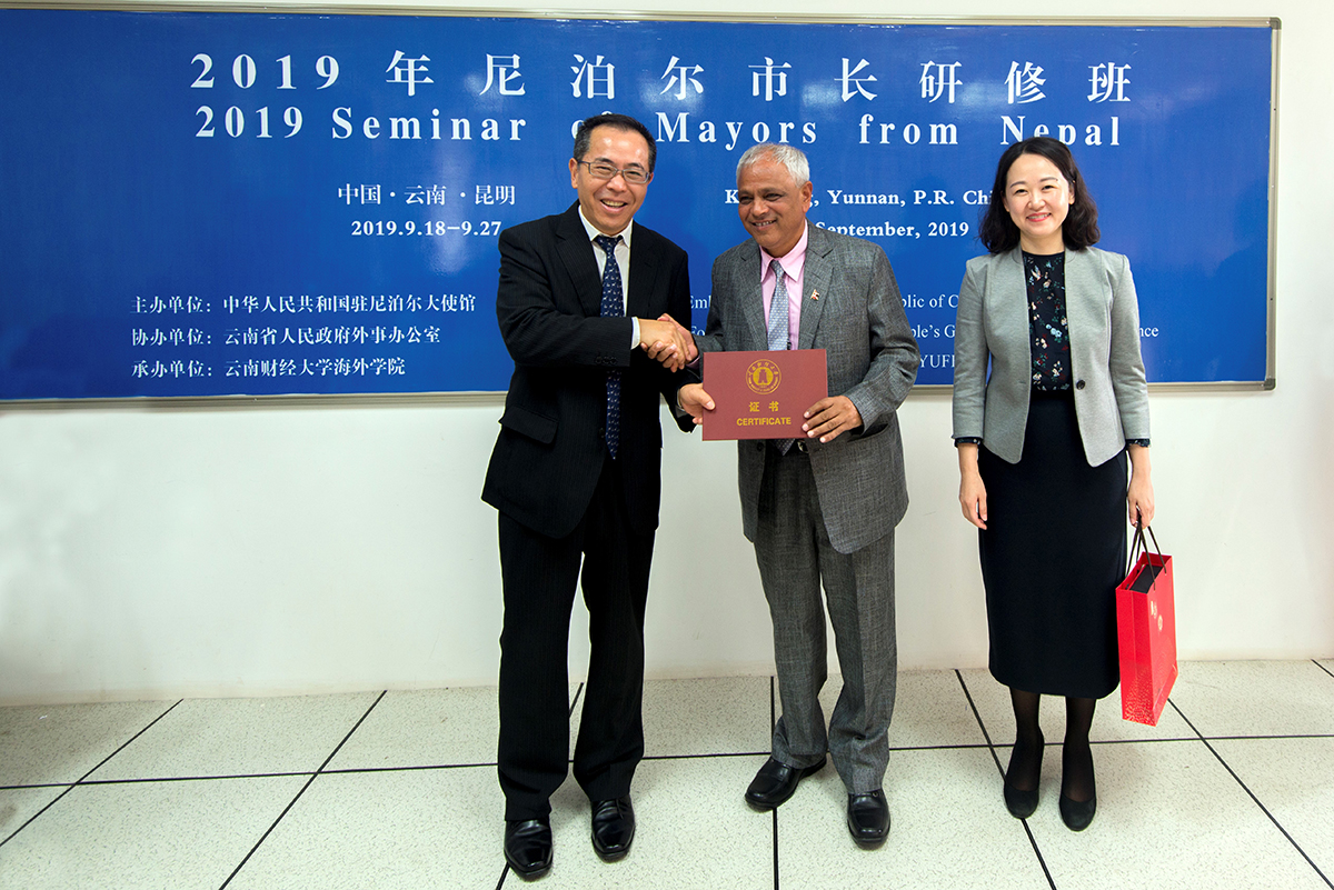 9月26日下午,云南省人民政府外事办公室副主任杨沐、bat365官网副校长殷红参加研修班结业典礼。杨沐副主任对尼泊尔市长研修班结业表示祝贺,希望各位市长在本次培训班结束后带着中国人民的美好情谊返程,将在中国所见所学用于尼方经济社会建设,助力尼方实现“繁荣尼泊尔,幸福尼泊尔人”的发展目标,共同推动中尼命运共同体建设。殷红副校长在致辞中也对市长们到bat365在线中国官网登录入口交流学习表示热烈欢迎,希望研修班学员作为中尼文化交流的使者,进一步巩固中尼传统友谊。研修班学员对bat365官网的课程设计、考察安排和热情接待给予了高度评价。