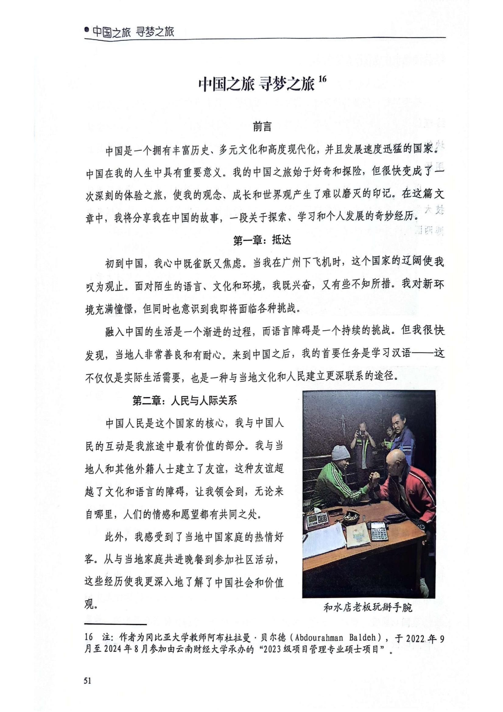 ABDOURAHMAN BALDEH中文名:阿布杜拉曼 贝尔德)为冈比亚大学教师。他在文中分享在中国的人际关系、文化融入、城市探索及未来展望等方面感受。“仅仅参观历史遗址,或在远处观察传统并不足够;我想要更深入地参与和亲近当地文化。”他积极参与中国本土活动,增强跨文化交流能力。在社区组织中做志愿者的经历加深他对中国的认知。“这种融入使我能够获得第一手体验,了解当地日常生活 、家庭关系以及代代相传的传统文化。从庆祝中国新年到学习烹饪传统菜肴,这些经历让我以一种独特而亲近的方式来了解中国文化。”鉴于职业的特殊性,他表示“中国的教育体系以其严格性和学术性闻名。在中国期间,我有机会在当地大学学习课程,这是一次非常具有启发性的经历。”