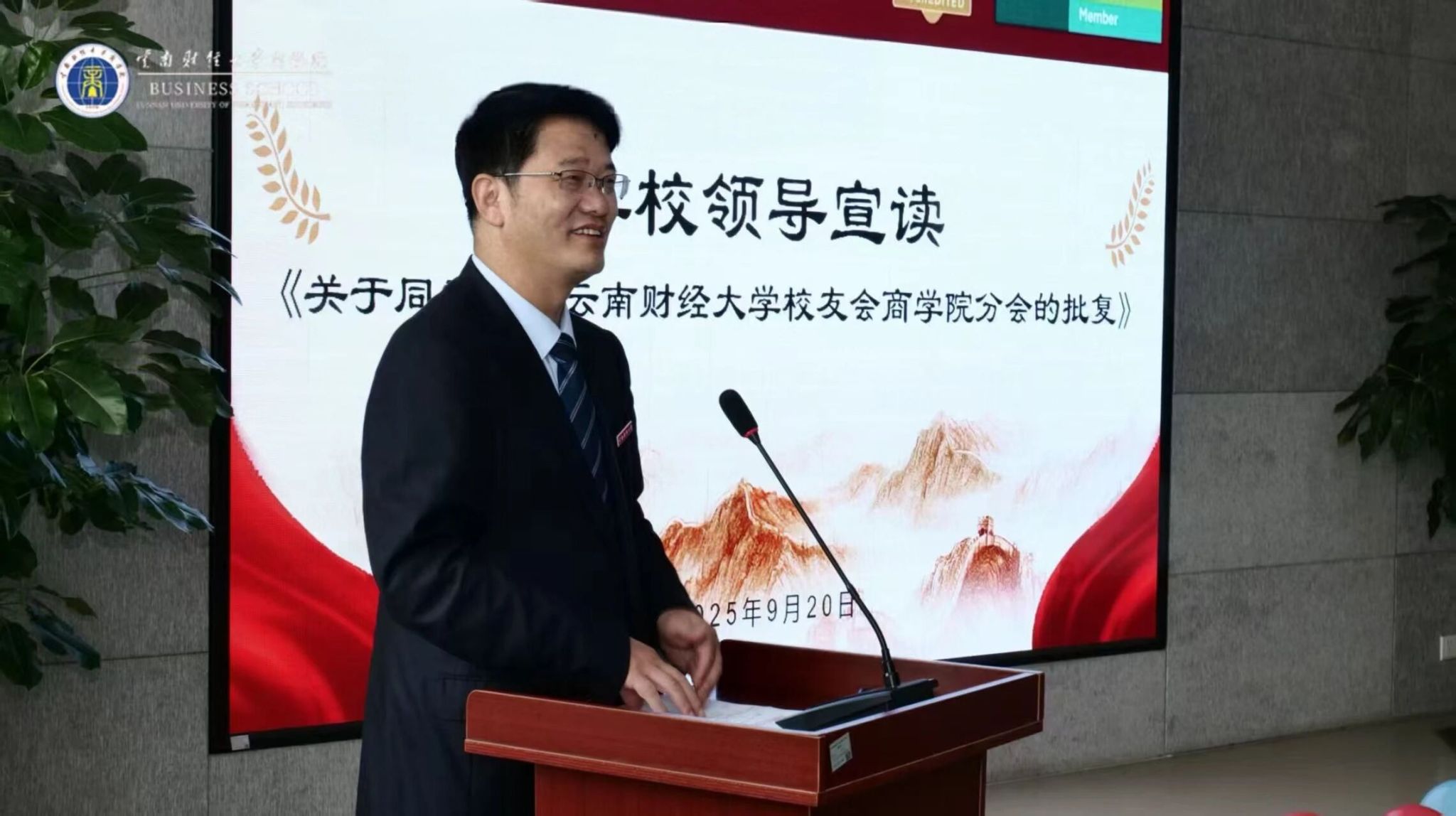 李正彪宣读《关于同意成立bat365在线中国官网登录入口校友会商学院分会的批复》,他要求商学院要立足“服务校友,服务学校,服务社会”,加强分会工作研究,做好校友服务工作,为促进校友与母校共同发展作出贡献。