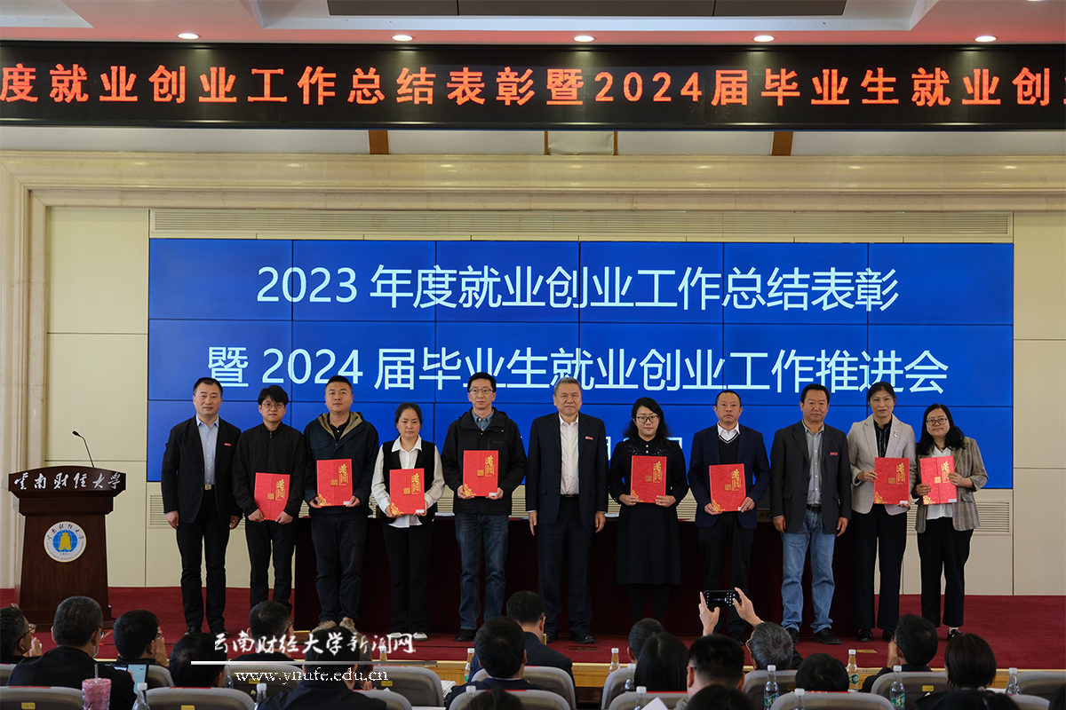 会上,校领导为获得2023年度大学生就业创业工作先进集体及个人代表颁奖。财政与公共管理学院作交流发言。