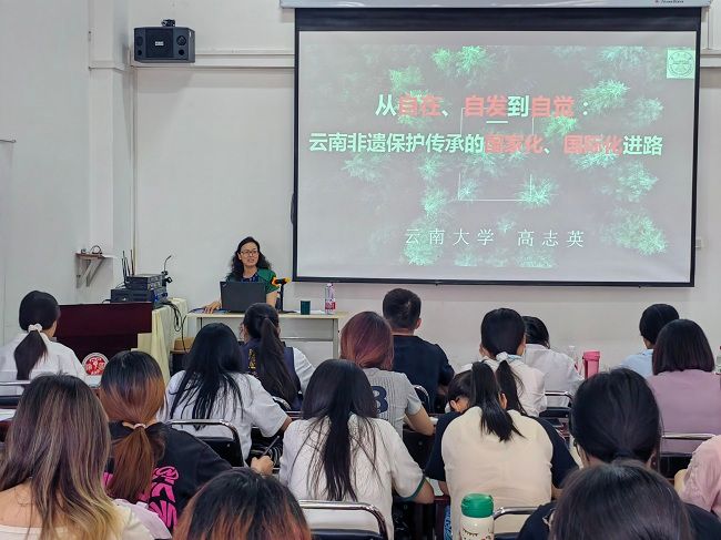 6月14日,2024年云岭大讲堂(云财讲坛)第三讲《从自在、自发到自觉:云南非遗保护传承的国家化、国际化之路》在学校博远楼403学术报告厅举行,讲座由科学技术处与国际语言文化学院联合主办,云南大学特聘(二级)教授高志英受邀主讲,国际语言文化学院党委副书记俞虹主持。