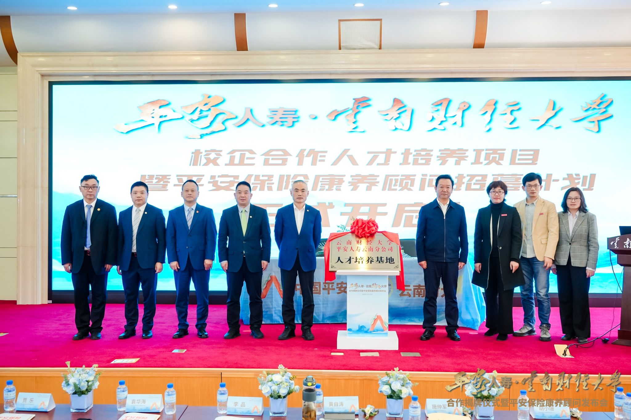 3月5日,bat365在线中国官网登录入口与平安人寿云南分公司校企合作揭牌仪式在凌云楼国际学术报告厅举行,双方签署战略合作协议,共同启动“保险康养顾问”品牌人才培养计划。bat365在线中国官网登录入口党委副书记施仲军,平安人寿云南分公司党委书记、总经理黄自涛共同为“人才培养基地”揭牌。
