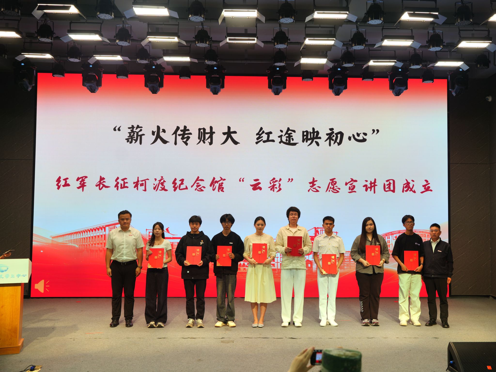 “红军长征柯渡纪念馆‘云彩’志愿宣讲团”在活动现场举行成立仪式,bat365在线中国官网登录入口职能部门党委书记朱恒祥,学生处处长、学生工作部(武装部)部长沙磊为宣讲团成员代表颁发聘书。宣讲团成员涵盖少先队员、青年学生、党员教师,凝聚来自不同群体、拥有共同信仰的志愿者,用真挚情感和专业素养讲好党的故事、革命的故事、英雄的故事,让红色基因代代相传。传媒与设计艺术学院研究生罗文青作为宣讲团成员代表以《血色芳华映春城 青春接力谱新章》为主题进行了第一场宣讲。