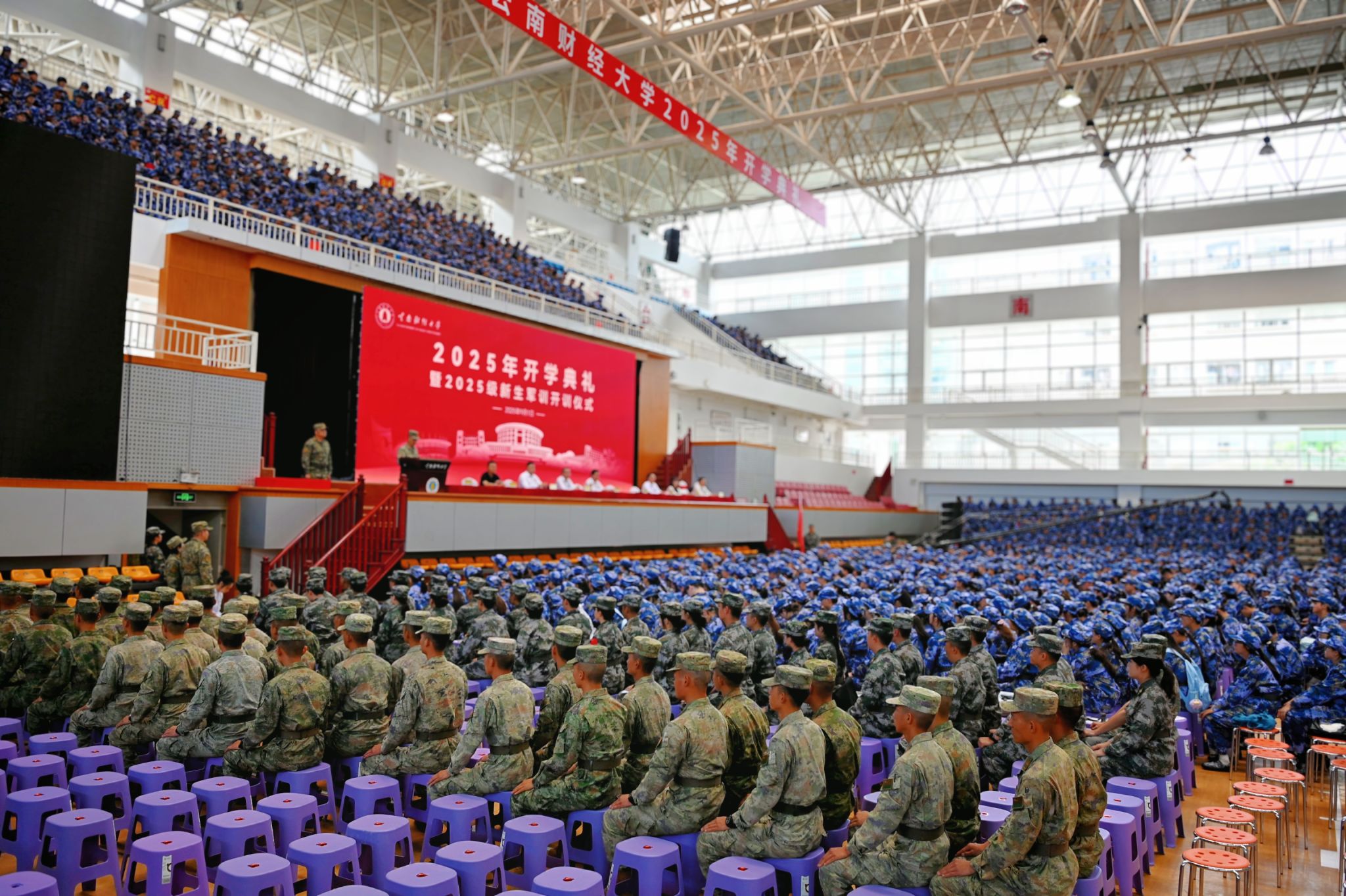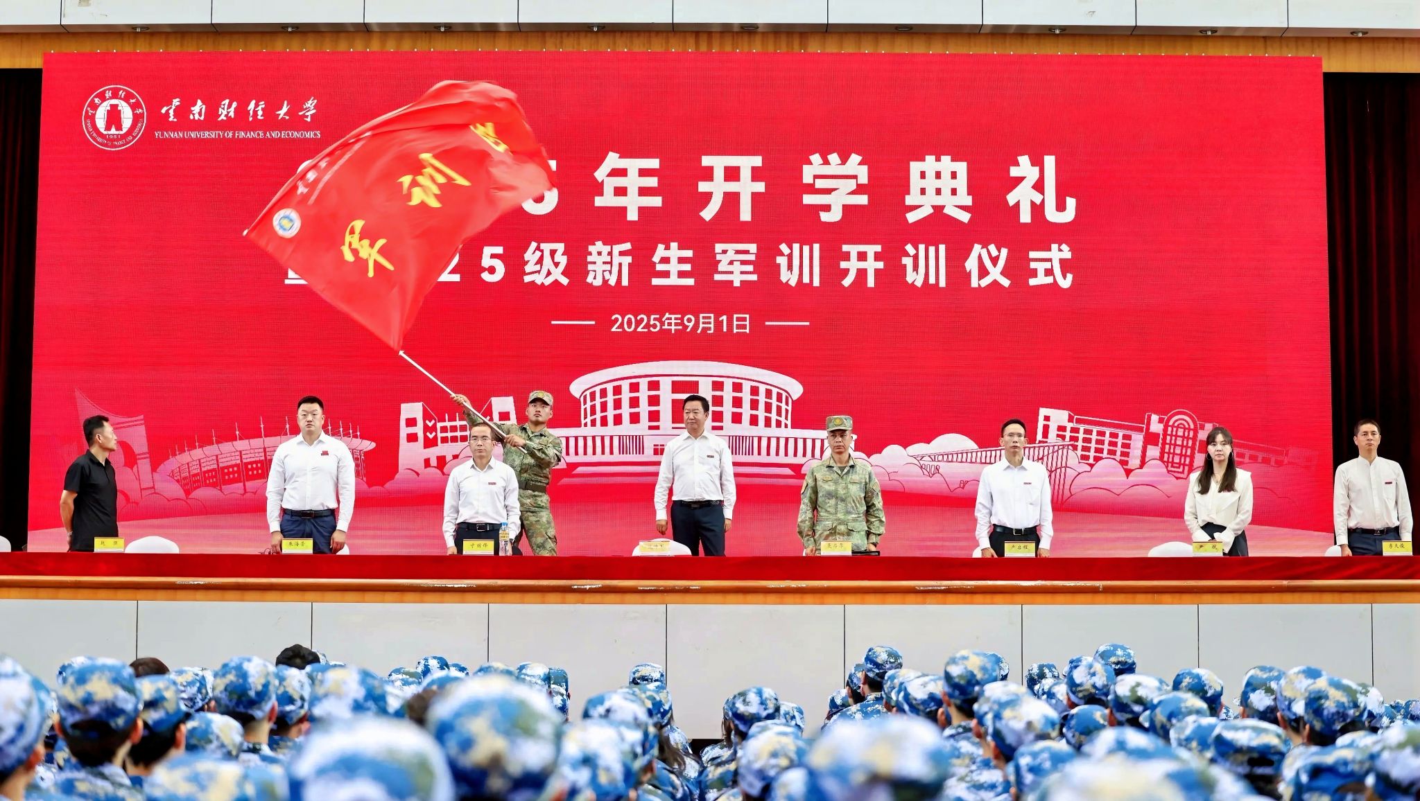 9月1日,学校2025级学生军训开训仪式分别在龙泉路校区南院体育馆、安宁校区灵溪广场举行。学校党委副书记、军训工作领导小组组长施仲军,中国人民解放军31634部队副参谋长、军训工作领导小组副组长聂存厚,学校军训工作领导小组成员单位负责人、各学院分管学生工作负责人,以及承训教官、各学院带队教师、2025级8000余名参训学生参加开训仪式。仪式由学校武装部部长沙磊主持。
