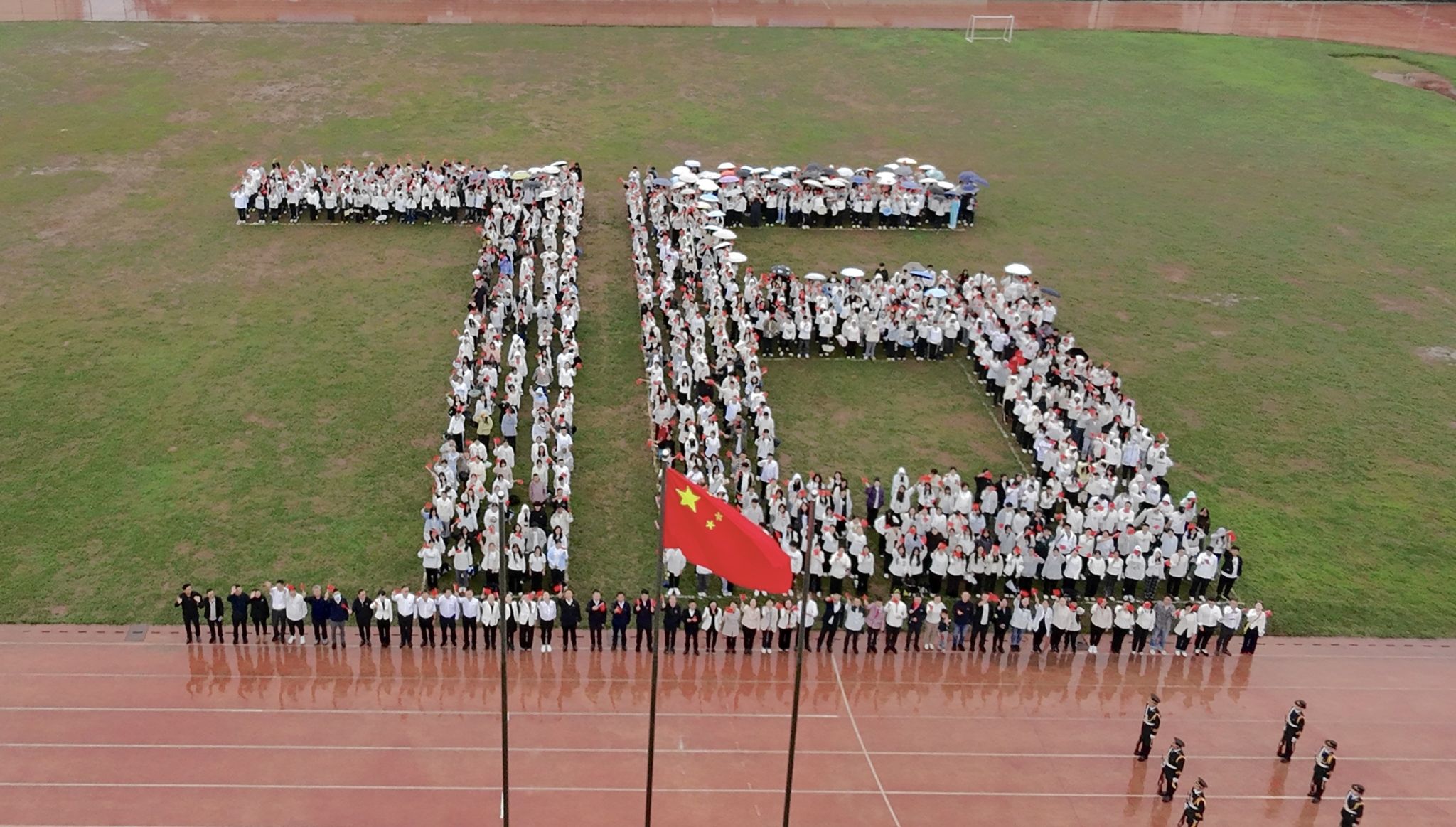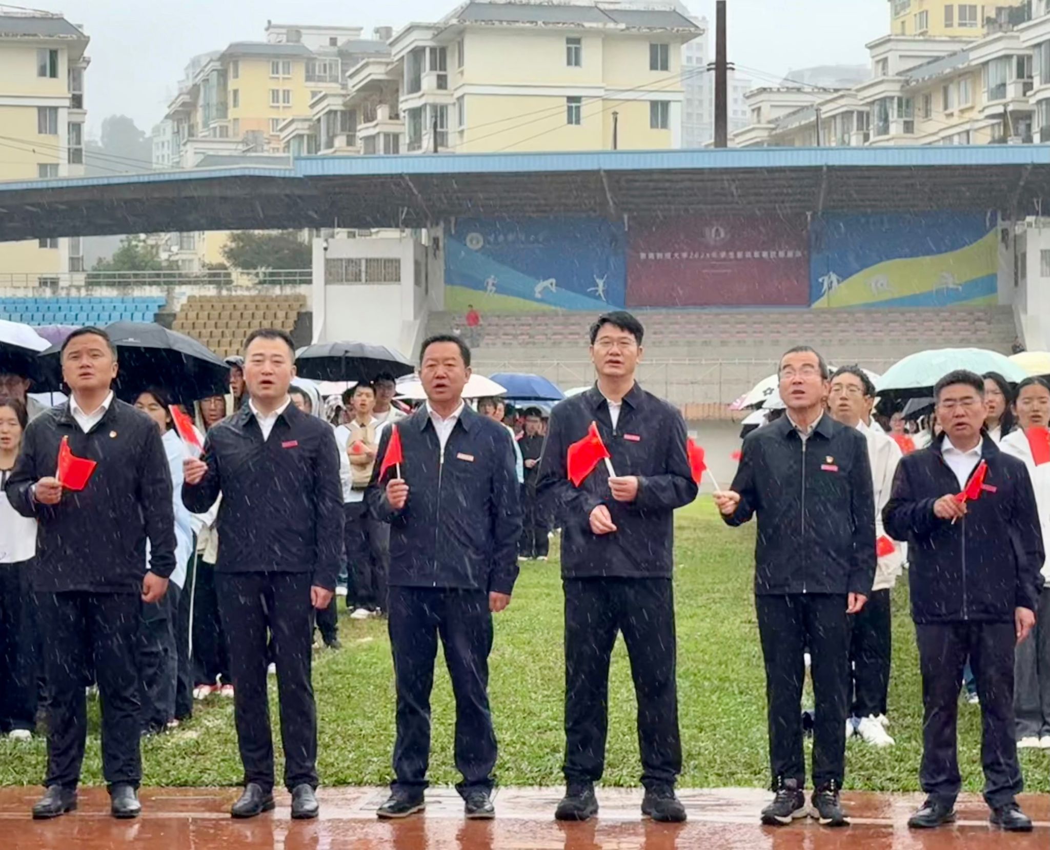 10月1日清晨,bat365在线中国官网登录入口国庆升旗仪式在龙泉路校区南院田径场庄严举行。学校领导、校属各单位教职员工代表和900余名学生代表齐聚雨中,共同参与这场意义非凡的爱国主义教育课堂。