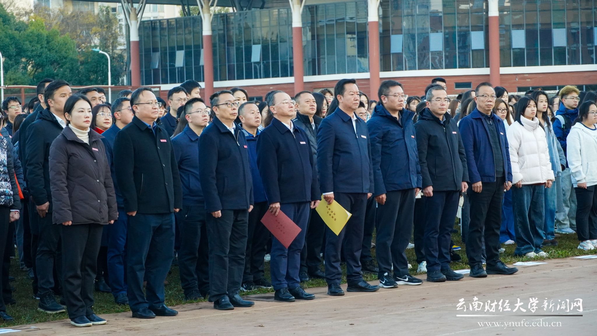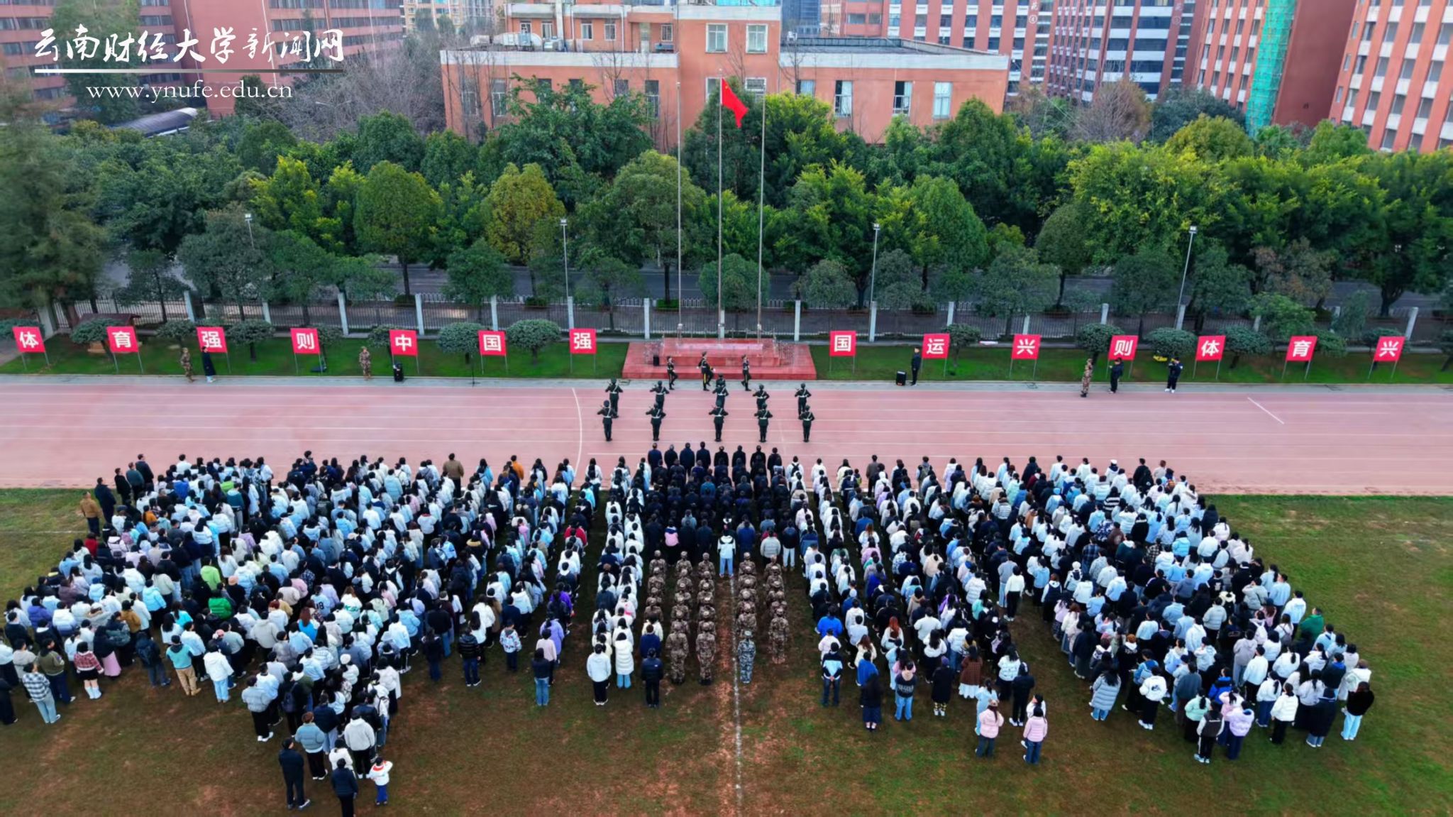 岁序更替,华章日新。2026年1月1日,学校在龙泉路校区南院田径场举行元旦升国旗仪式。在家的校领导、校属各单位主要负责人、龙泉路校区各学院学生代表共1000余人参加仪式,共同聆听国家主席习近平2026年新年贺词。仪式由校党委副书记施仲军主持。