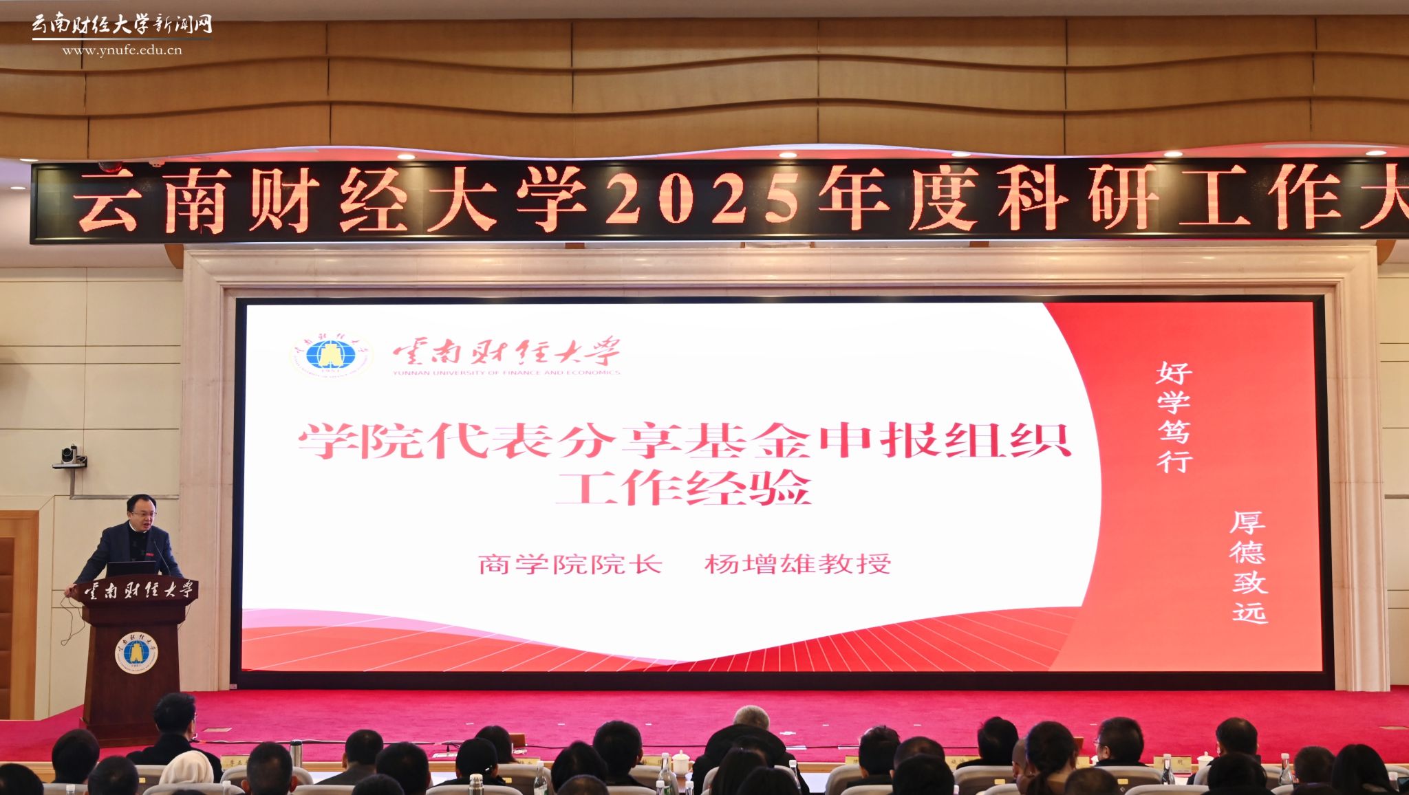科学技术处处长段云龙汇报了2025年度学校科研工作开展情况。商学院院长杨增雄、国际工商学院副院长刘丽芳作为学院代表分享了基金申报组织工作经验,物流与管理工程学院刘森作为科研团队代表分享了科研服务产业工作经验,国际工商学院杨文华、财政与公共管理学院张蓉、旅游与酒店管理学院李永祥作为2025年度“三大基金”立项教师代表分享了基金申报经验。