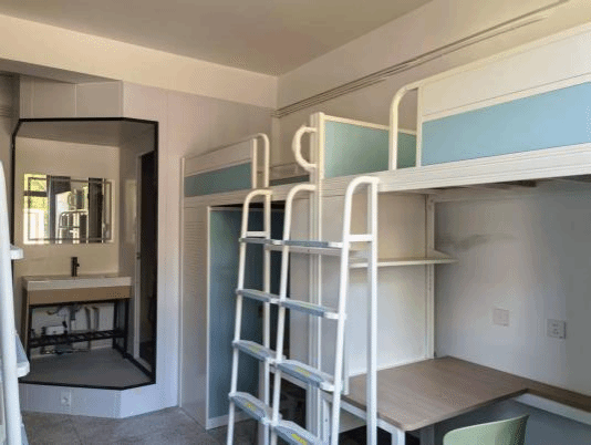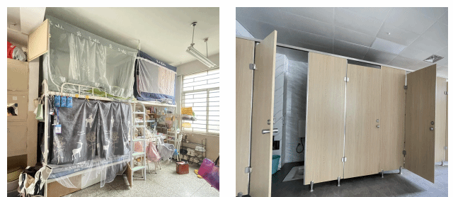 蕴华苑1、2栋学生公寓建于2002年,已投入使用23年。改造后的学生公寓将原有的6人间调整为4人间,共提供260间宿舍,包括3间无障碍宿舍,可满足1034名学生住宿需求。针对原有宿舍无独立卫生间的问题,项目采用"装配式集成卫生间",实现干湿分离、功能完备的独立卫浴配置。宿舍楼内增设自习室、活动室、洗衣房、爱心宿舍等多功能用房,实现从单一居住空间向学习、生活、交流、育人一体化社区转型,成为学校“一站式”学生社区建设的有力支撑。