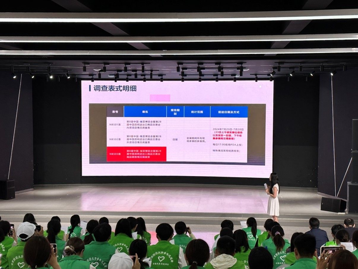为确保志愿者们能够更好地胜任岗位工作,学校于7月10日组织了志愿者岗前培训。在基础培训环节,校团委赵玥老师为志愿者们全面深入介绍省情市情,并围绕南博会概况、志愿者角色认知、安全知识、沟通技巧、礼仪规范等对同学们进行指导。在志愿服务专项培训环节,来自南博会会展统计部的陈尧老师一行重点围绕会展统计方法、数据来源、记录标准、收集方式等进行了详细讲解。