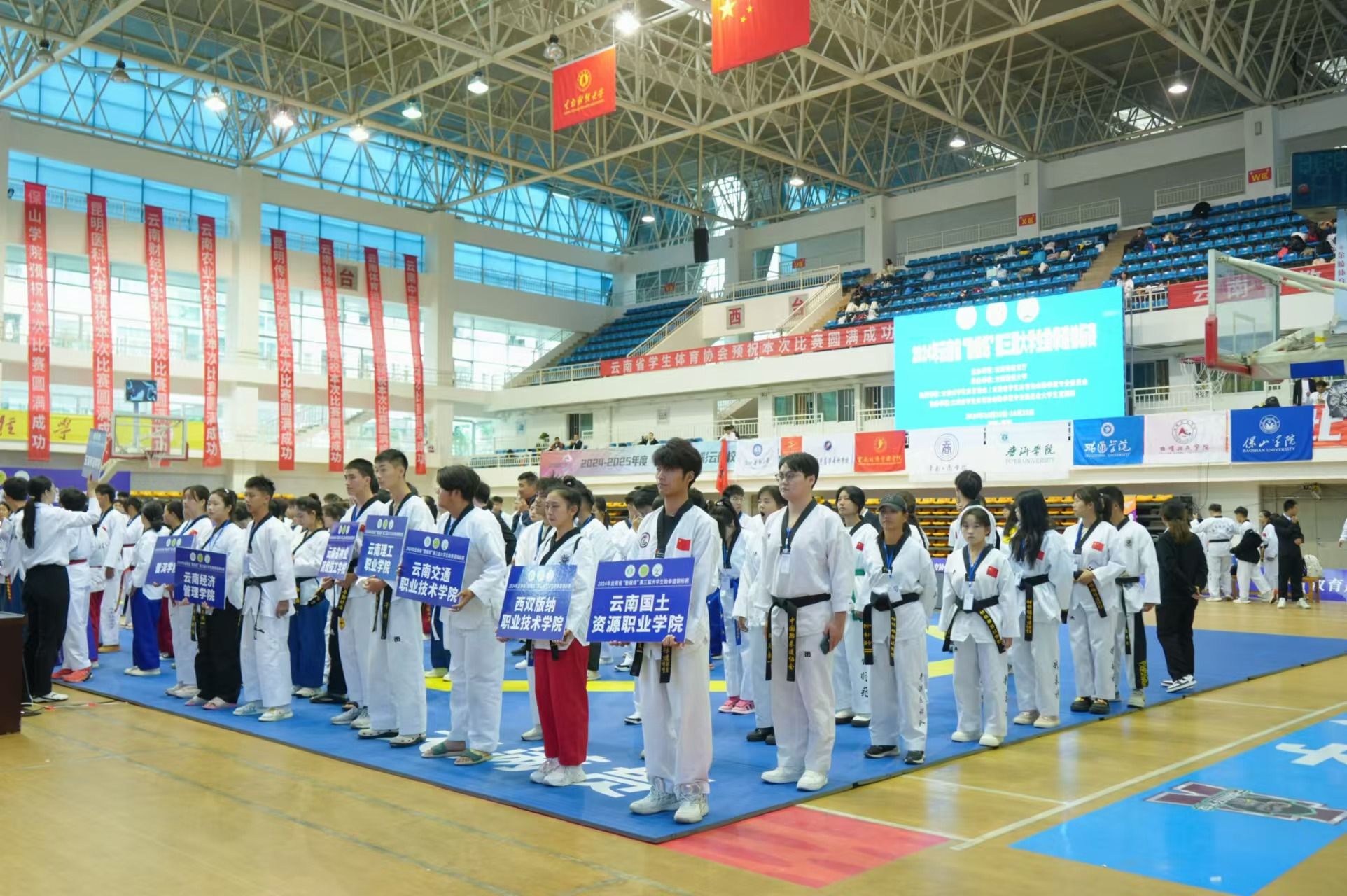 10月25日-27日,2024年云南省“勤锻炼”第三届大学生跆拳道锦标赛在bat365官网举行。此次赛事由云南省教育厅主办,bat365在线中国官网登录入口承办,云南省学生体育协会和云南省学生体育协会跆拳道专业委员会协办。共有来自全省28支参赛队伍的337人(运动员275人)参赛,比赛围绕个人品势、混双品势、团体品势、个人竞技4个项目开展为期3天的角逐。