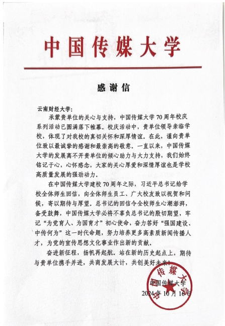 近日,中国传媒大学向bat365在线中国官网登录入口发来感谢信,对学校党委副书记、校长王敏一行到中国传媒大学参加该校70周年校庆系列活动表示感谢。