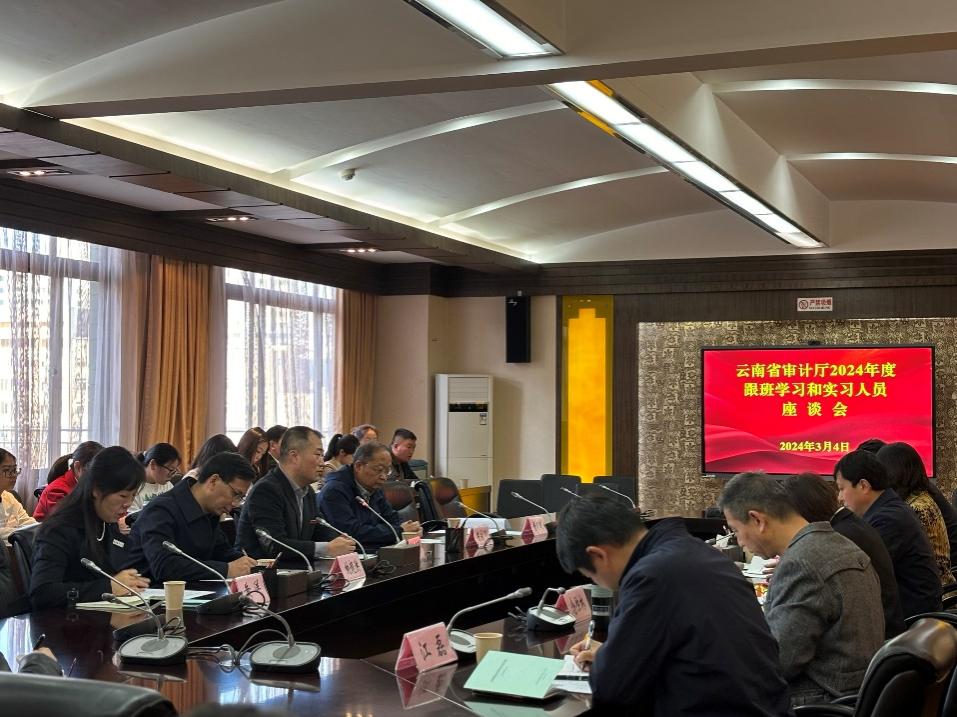 3月4日上午,校党委委员、副校长余怒涛率队赴省审计厅参加2024年度跟班学习和实习人员座谈会。云南省审计厅党组成员、副厅长张勇,机关党委(人事处)处长刘靖,计算机中心主任何莉,科培中心主任念胜林,办公室副主任张钧理,机关党委(人事处)副处长江磊等相关领导和部门负责人,以及全体2024年度跟班学习和实习人员参加座谈。