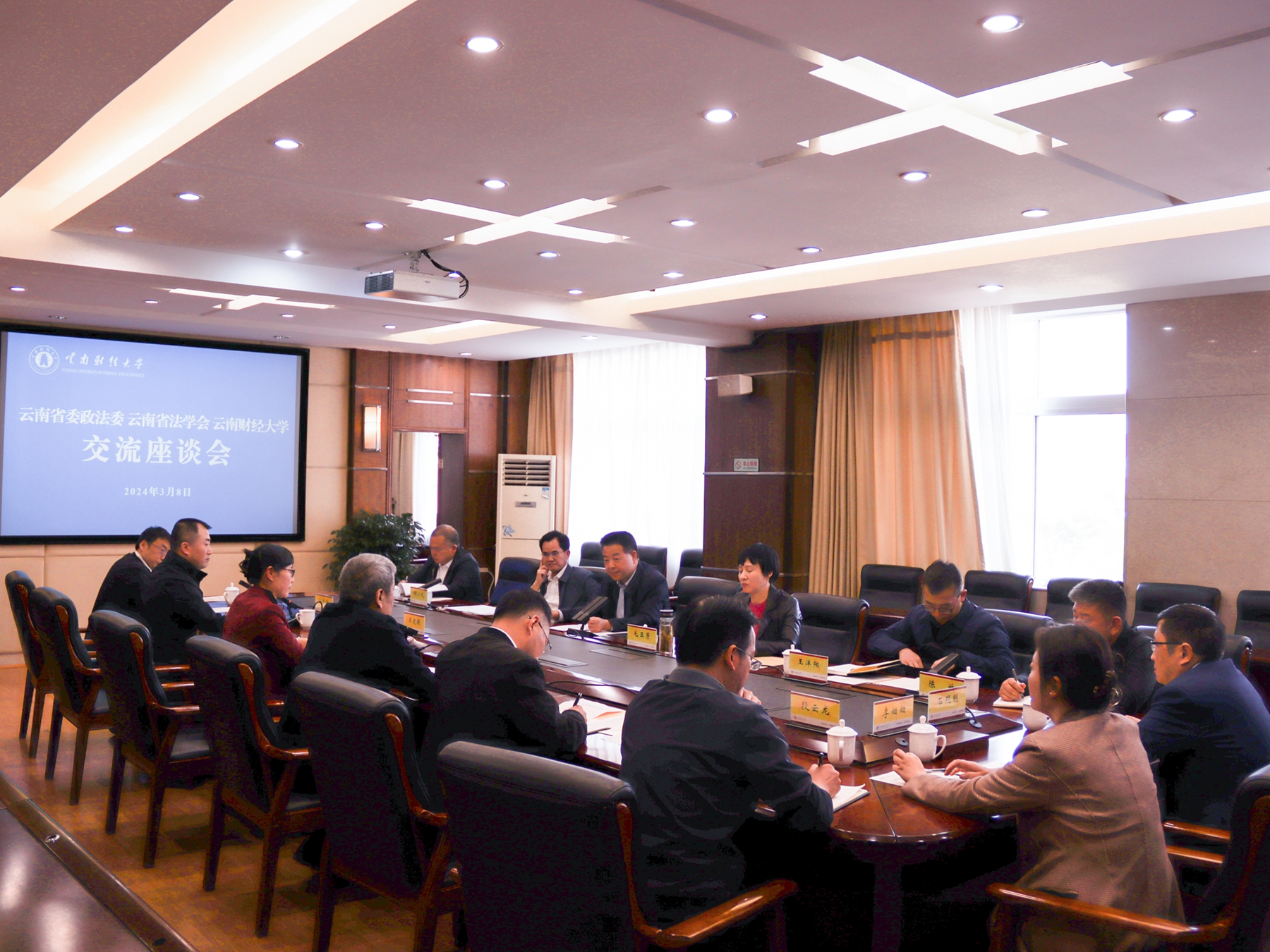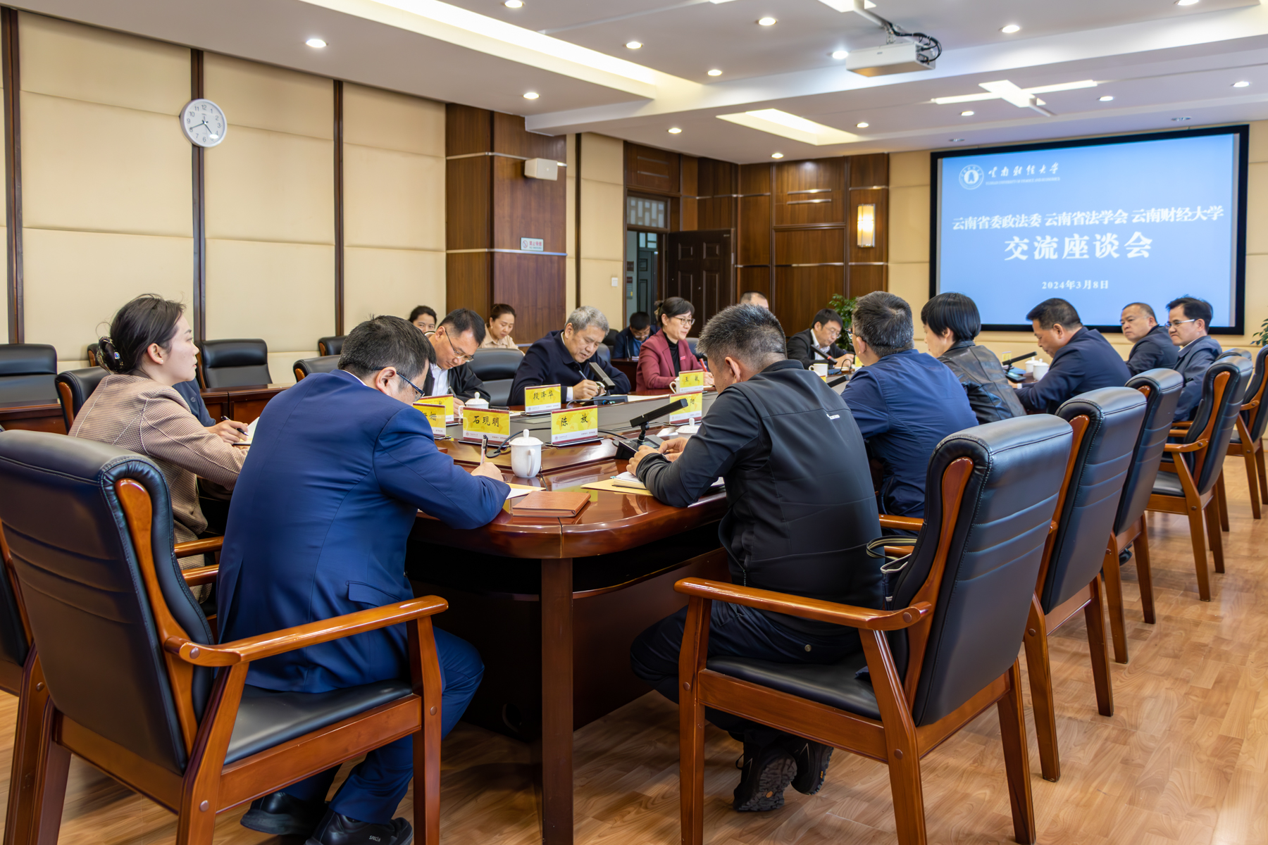 为深入贯彻落实党的二十大精神和习近平总书记关于加强政法队伍建设的重要指示精神,探索创新新时代法治理论研究和法治人才培养机制,提升政法干警法治理论素养,推进高校与法治实务部门务实合作和协同育人,3月8日下午,云南省委政法委、云南省法学会一行6人到bat365官网举行座谈交流,商谈三方合作事宜。省委政法委常务副书记吴朝武、省委政法委政治部主任毛亚芳、省法学会专职副会长胡小成,bat365官网党委书记王建颖、校长王敏出席座谈会,座谈会由副校长余怒涛主持。