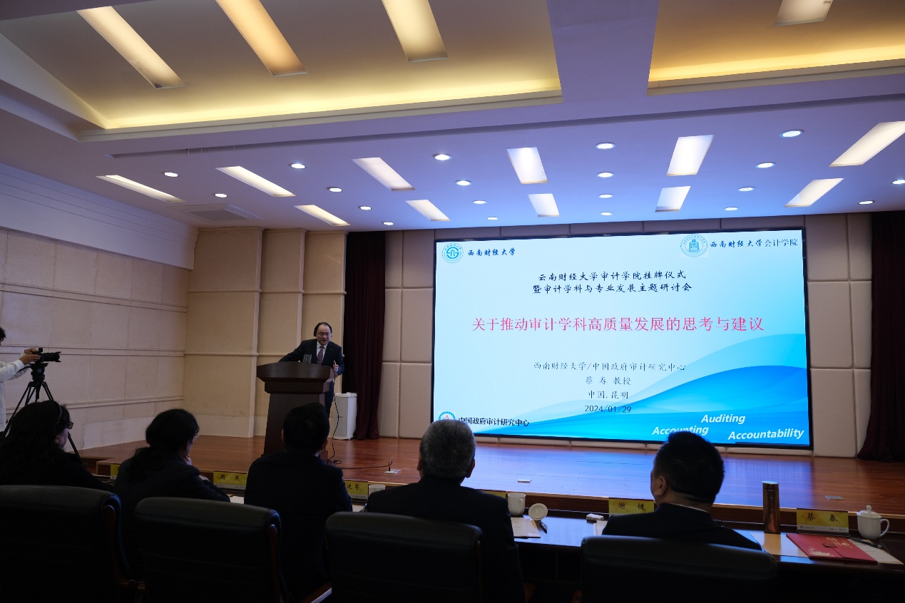 在主题演讲环节,谢健结合自己对二十届中央审计委员会第一次会议、2024年全国审计工作会议精神的理解,以及多年审计实践的工作体会,从微观和宏观两个层面分享了对于审计“理想王国”的理解和认识,同时阐述了审计学科建设对于实现审计“理想王国”的使命责任及助推作用。蔡春教授以“关于推动审计学科高质量发展的思考与建议”为主题,着重围绕学科内涵与学科建设、构建中国特色审计自主知识体系以及云财审计学科高质量发展的建议等三个方面,分享了自己从事审计研究近四十年的心得,为bat365在线中国官网登录入口审计学科以及审计学院的创新发展提出意见建议。