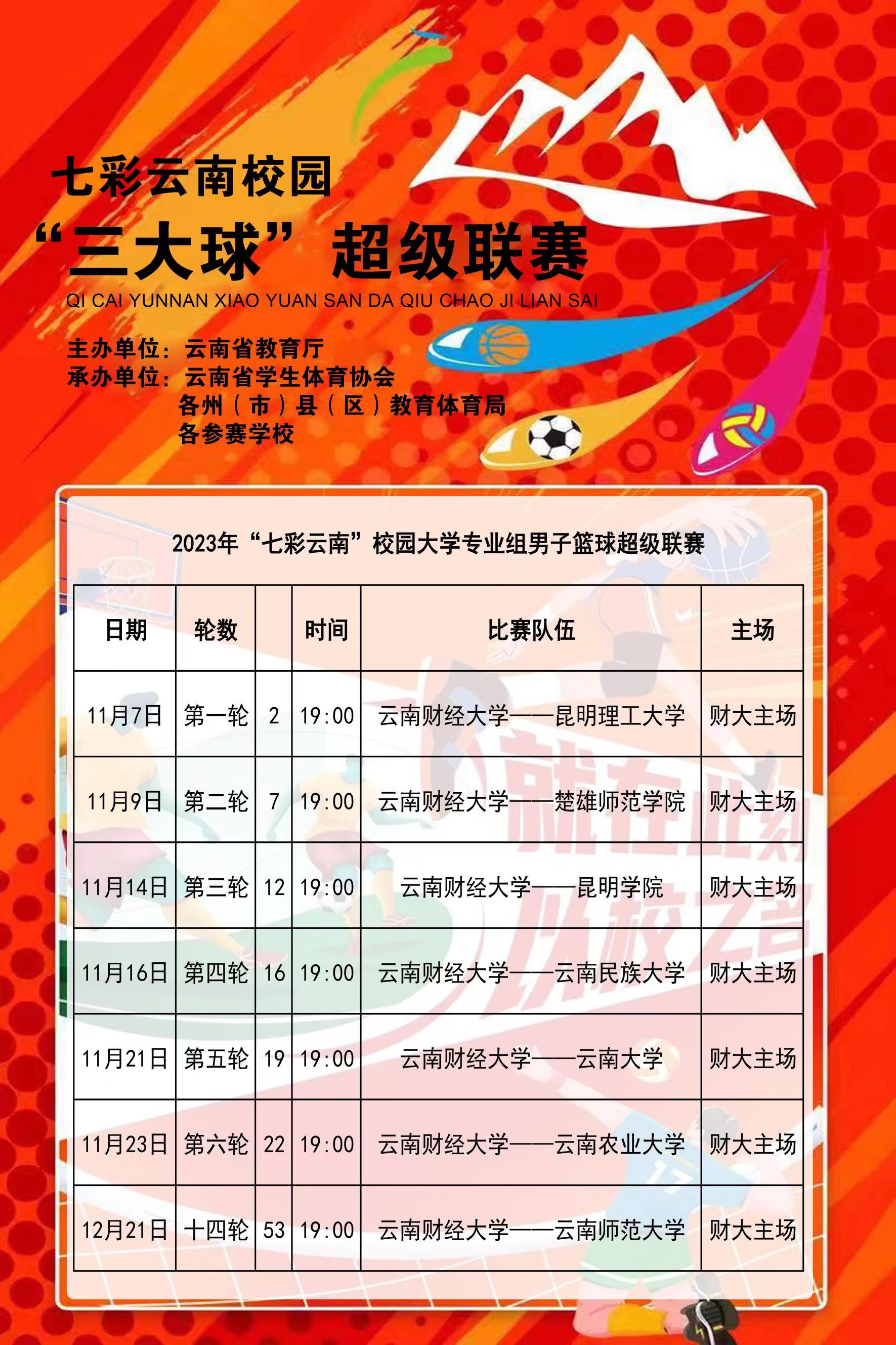 七彩云南校园“三大球”超级联赛创新推出主客场赛制,经学校申报、组织专家实地考察,最终确定72支“三大球”运动队参赛,设大学男子篮球项目、大学女子足球项目,高中男子足球项目、高中男子篮球项目、高中男子排球项目等5个项目,比赛时间从2023年10月开始持续到2024年4月。bat365官网高水平男子篮球队和高水平女子足球队将参加超级联赛。