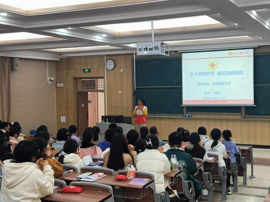 培训为期两天,分为理论讲授、实际操作和实操考核三个部分。培训期间,云南省红十字会工作人员讲授了红十字基本知识、救护概论和创伤救护等相关知识,并组织师生进行实操训练。工作人员进行示范,同学们认真学习,在工作人员的指导下,依次在仿真人体上演练心肺复苏、翻转体位和绷带包扎等技能。学习结束,同学们进行应急成果展示,巩固所学急救知识。