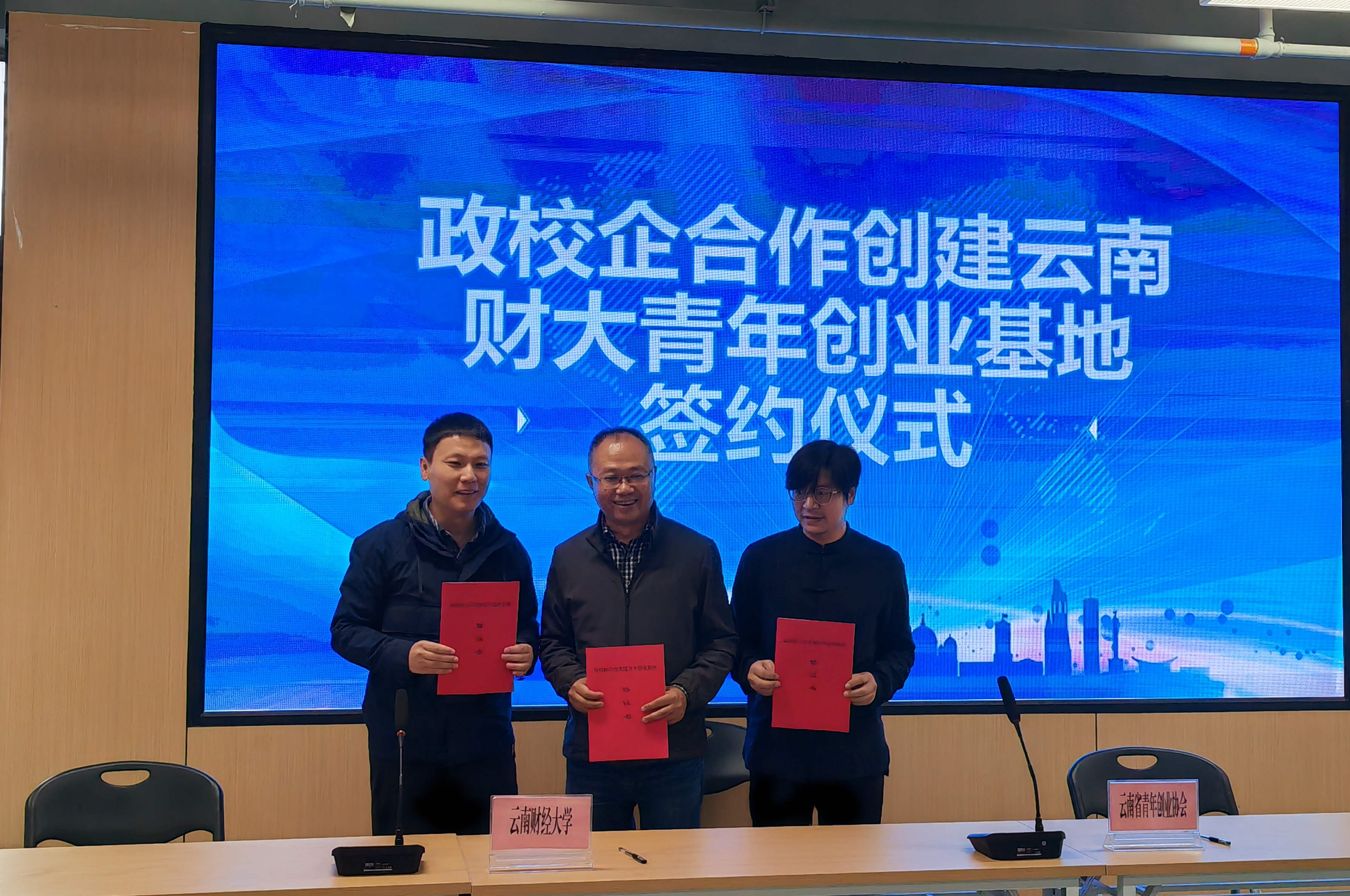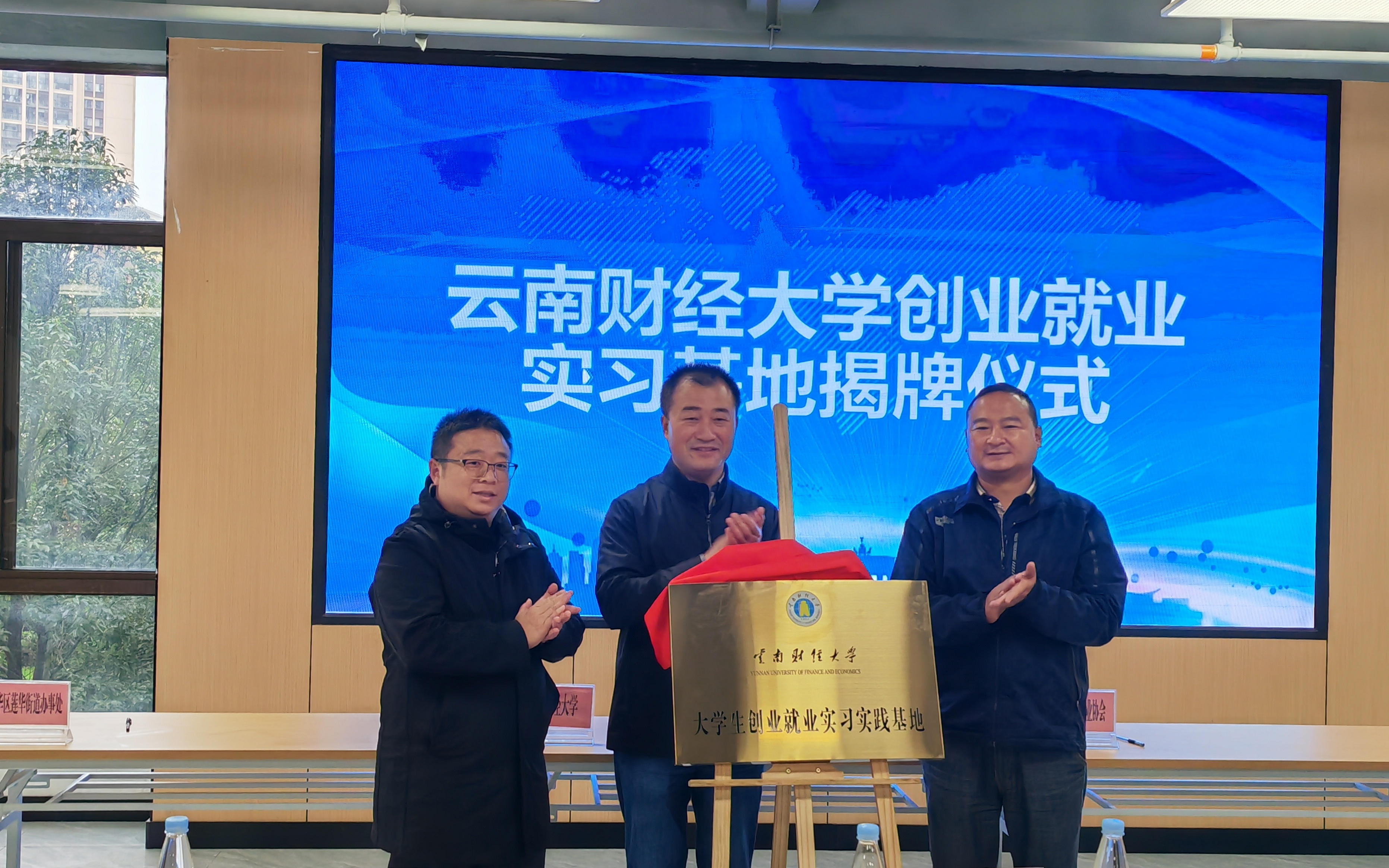 学校副校长余怒涛、云南省青年创业协会会长贺靖、五华区政府莲华街道党工委书记张兴爻共同为bat365在线中国官网登录入口青年创业就业实习基地揭牌。学校招生职业发展中心主任霍嘉军、青创实业集团常务副总裁邓成昆、五华区政府莲华街道办事处主任徐加上台签约。