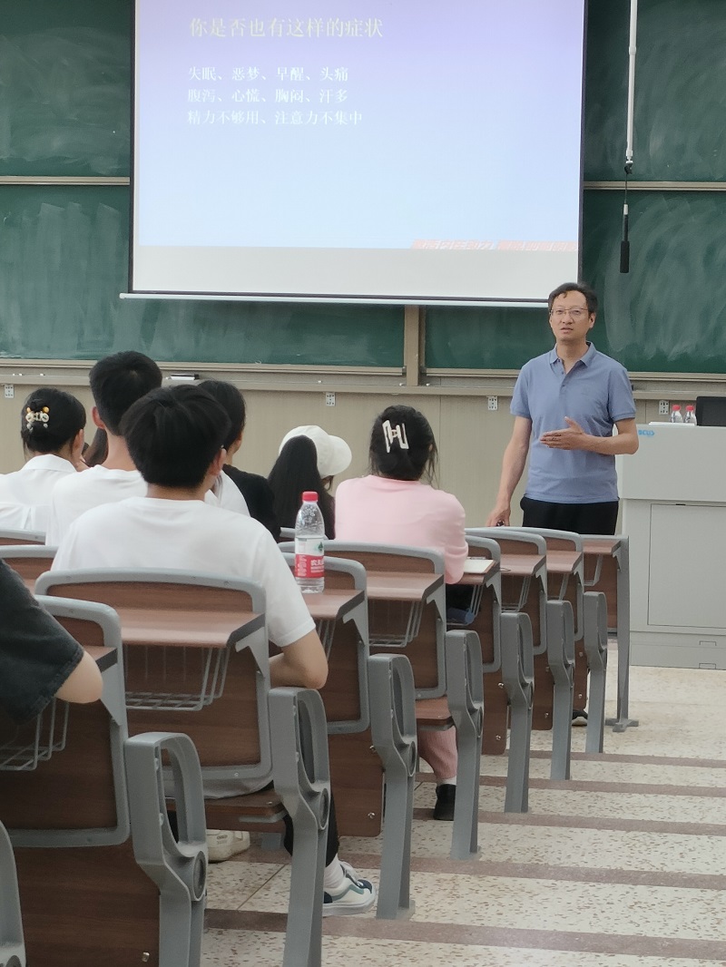 杨婷详细介绍了心理健康的标准和类型、什么是抑郁情绪和抑郁症、睡眠质量不同程度的突出表现、常见的心理问题及影响心理健康的因素等知识,分析了轻中重度焦虑的症状和压力影响行为的规律。杨婷表示,压力是客观存在,是与时俱进的,压力感是现代人的存在感,避免压力只能累积压力。面对压力,她鼓励大学生在正确认识自己心理状态的基础上,学会主动通过加强体育锻炼等方法自我调节,在需要的时候主动向心理老师、精神科医生寻求专业帮助。
