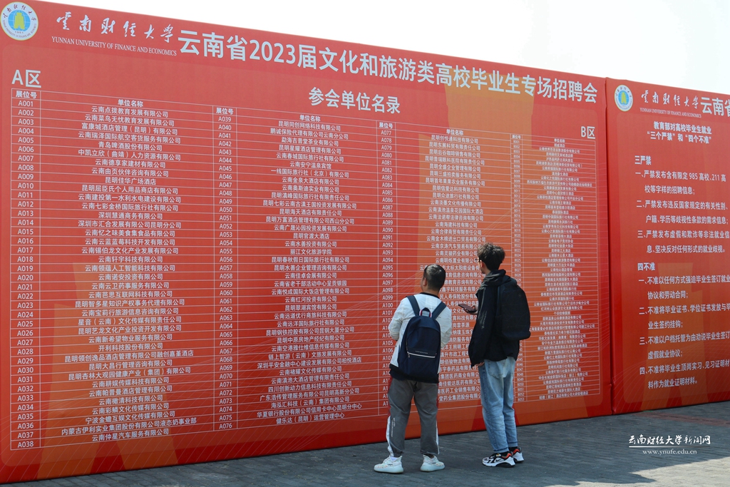 此次招聘会有来自云南、浙江、上海、广东、内蒙古、新疆等10余个省、市、自治区的160余家优质单位参会,提供招聘岗位450余个,招聘需求达6000余人。招聘企业中,文化旅游类企业占53%,其他兼具金融、信息传播、软件和信息技术等类型企业占比47%。云南建投第一水利水电建设有限公司、云南红河投资有限公司、云南省国际旅行社有限公司、青岛啤酒股份有限公司、华为全资子公司—深圳慧通商务有限公司、昆药集团医药商业有限公司、昆明钢铁控股有限公司昆钢大厦分公司、昆明翠湖宾馆有限公司、屈臣氏等国内知名用人单位纷纷到校选聘人才。