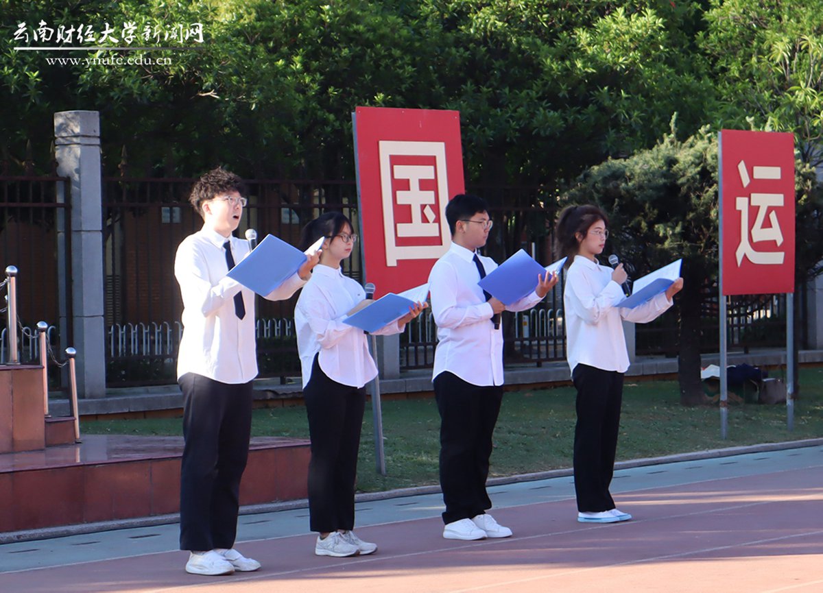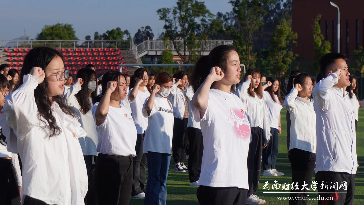 优秀团员代表、会计学院王玉环同学和旅游与酒店管理学院胡馨允同学分别做国旗下的演讲。作为学生代表号召云财青年坚定不移听党话、跟党走,努力学习储备知识能量,提升专业技能,练就过硬本领,在青春赛道上奋力跑出最好成绩。