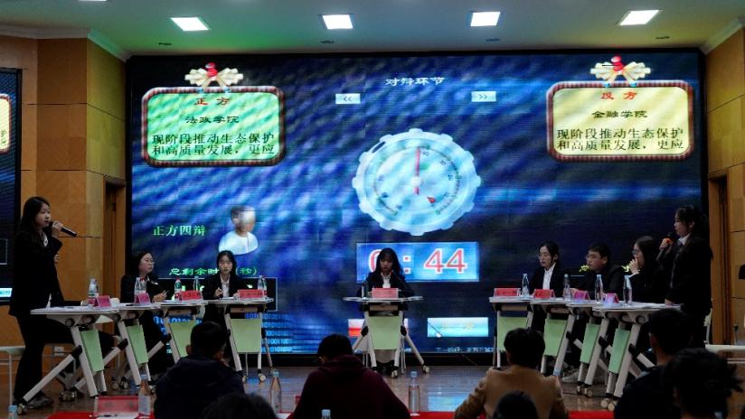 决赛的第一场是季军争夺站,来自法政学院与金融学院选手就“现阶段推动生态保护和高质量发展,更应注意产业转型/人才引进”主题展开辩论,双方在辩论中你来我往,据理力争,虽辩论激烈但不失学子礼节。