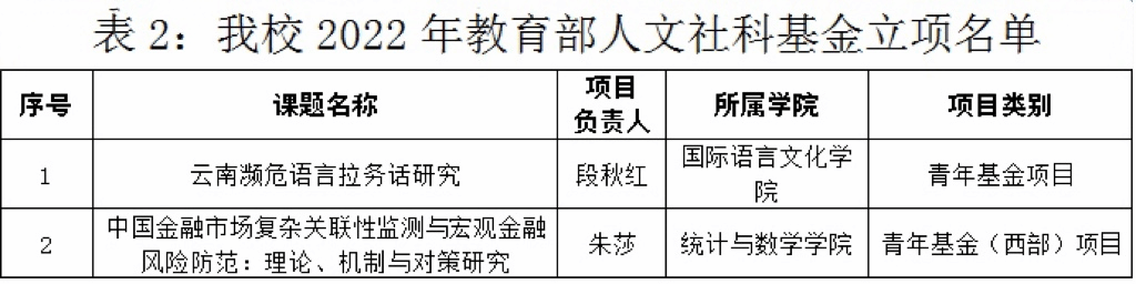 近日,全国哲学社会科学办公室、教育部社科司下达了2022年国家社科基金、教育部人文社科基金立项名单,bat365官网共获10项课题立项资助。其中,国家社科基金立项8项 (一般项目2项、西部项目6项),资助经费160万元;教育部人文社科基金立项2项。在此,向获得立项的老师表示衷心祝贺,希望全校老师再接再厉,在2023年各类课题申报中再创佳绩。具体名单如下: