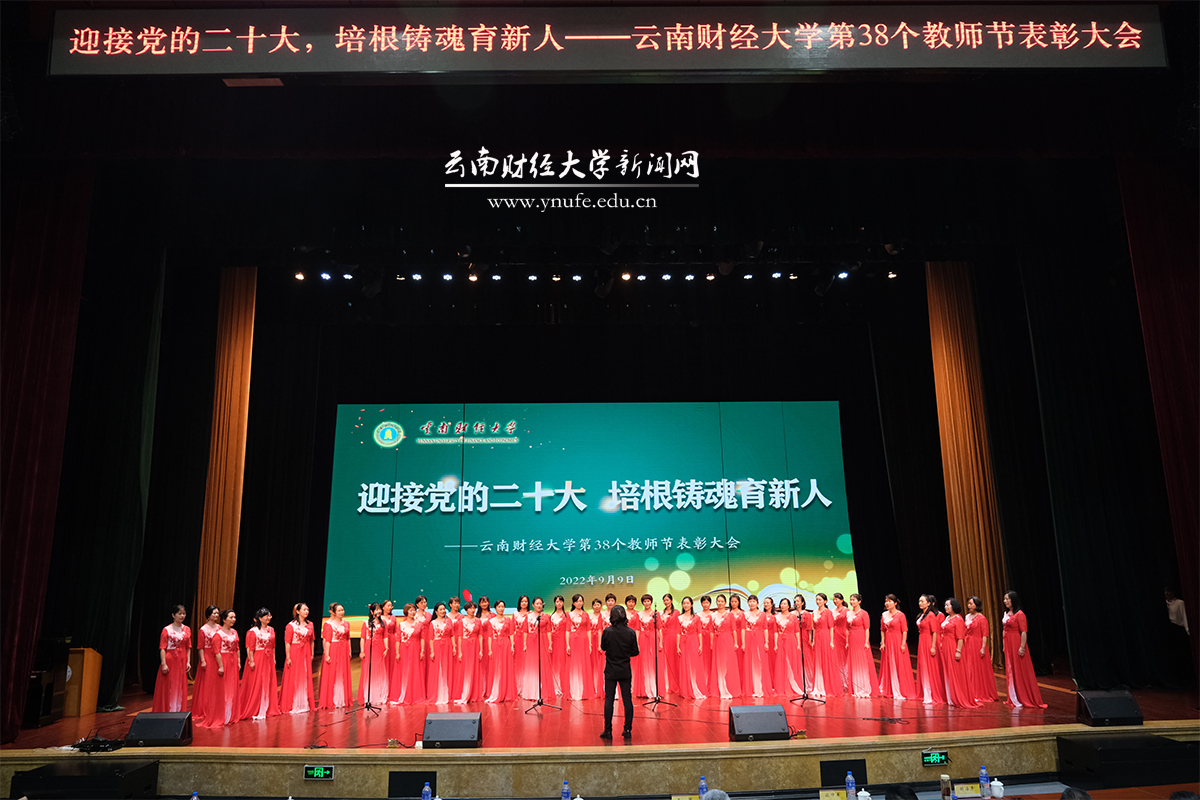 bat365官网教职工合唱团演唱了《祖国,慈祥的母亲》拉开表彰大会的序幕;大会现场还播放了全国各地的云财学子为老师们送上的祝福视频;身在文山州马关县坡脚镇的bat365官网全体驻村干部也制作了视频为全校教职员工送上教师节的祝福。表彰大会以直播的方式在线上同步播出。