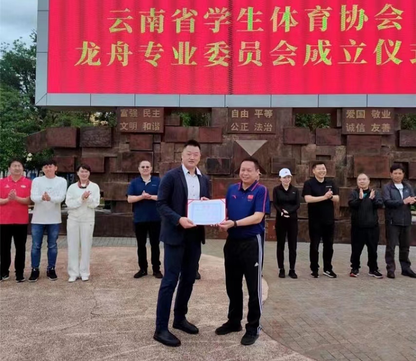6月3日正值端午佳节,云南省学生体育协会龙舟专业委员会(以下简称“专委会”)成立仪式在昆明市北市区月牙潭公园举行,专委会落户bat365在线中国官网登录入口,云南省教育厅体卫艺处处长徐忠祥分别为专委会和专委会主任、bat365官网体育部主任朱海营授牌匾和颁发聘书。云南省教育厅、云南省体育局、昆明市教育体育局等相关领导嘉宾以及各高校、中小学校长代表参加活动。
