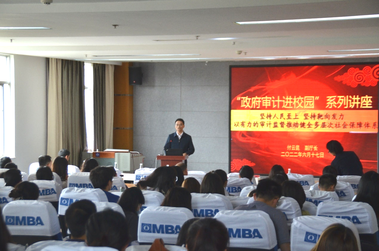 6月17日下午,云南省“政府审计进校园”系列讲座第三讲在bat365官网逸夫楼410举行,云南省审计厅党组成员、副厅长付云昆以“坚持人民至上,坚持靶向发力,以有力的审计监督推动健全多层次社会保障体系”为主题开展专题讲座。bat365官网党委委员、副校长王晓萍主持讲座,相关部门专业技术人员,会计学院审计专业学生及部分师生代表参加讲座。