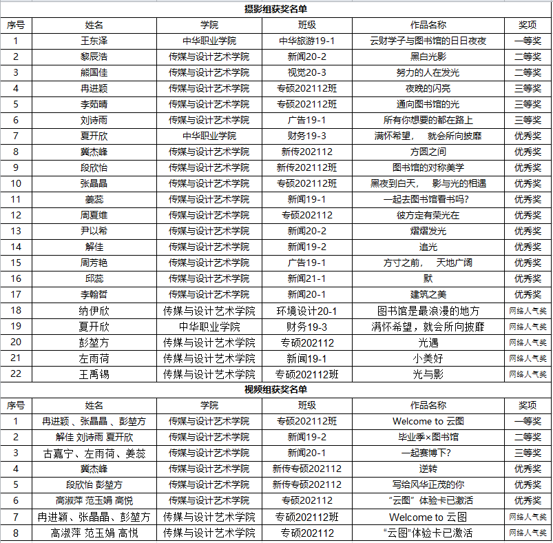 比赛于五月初开始,经过作品拍摄、宣传转发、评委打分等环节,来自中华职业学院王东泽同学的作品《图书馆的日日夜夜》获得摄影组一等奖,传媒与设计艺术学院冉进颖、张晶晶、彭堃方同学的作品《Welcome to“云图”》获得视频组一等奖。