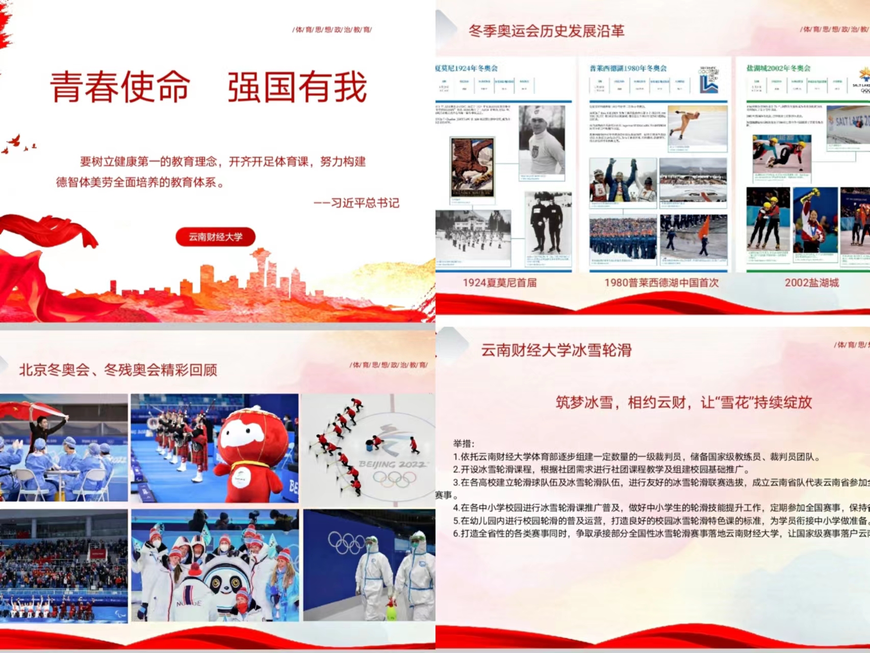 为学习贯彻习近平总书记在北京冬奥会、冬残奥会总结表彰大会上的重要讲话精神,落实《中共云南省委教育工委转发中共教育部党组关于学习贯彻习近平总书记给中国冰雪健儿重要回信精神的通知》要求,引导学生学习“胸怀大局、自信开放、迎难而上、追求卓越、共创未来”的北京冬奥精神,锤炼顽强拼搏、爱国奋进的意志品质,4月18日-22日,bat365官网利用体育课教学班级积极开展“青春使命 强国有我”专题体育思政教育。