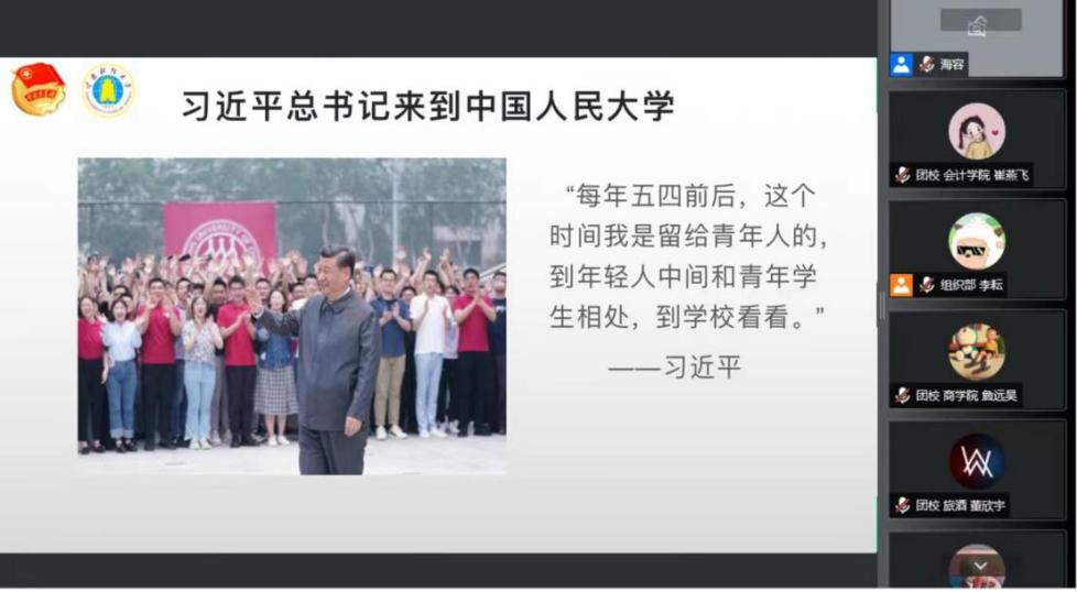 4月25日,在五四青年节即将到来之际,习近平总书记赴中国人民大学考察调研,并发表重要讲话。为深入学习贯彻总书记的重要讲话精神,4月27日,校团委书记曾蕾以线上领学的方式,组织bat365官网全体团委委员、青马学员及校级学生组织骨干共同开展学习。