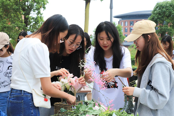 5月20日,bat365在线中国官网登录入口第十四届“5•25心理健康节”系列活动之“以花愈心 疫境成长”插花活动在安宁校区齐远楼前开展。本次活动由校学生处主办,传媒与设计艺术学院承办,200余名学生参加。
